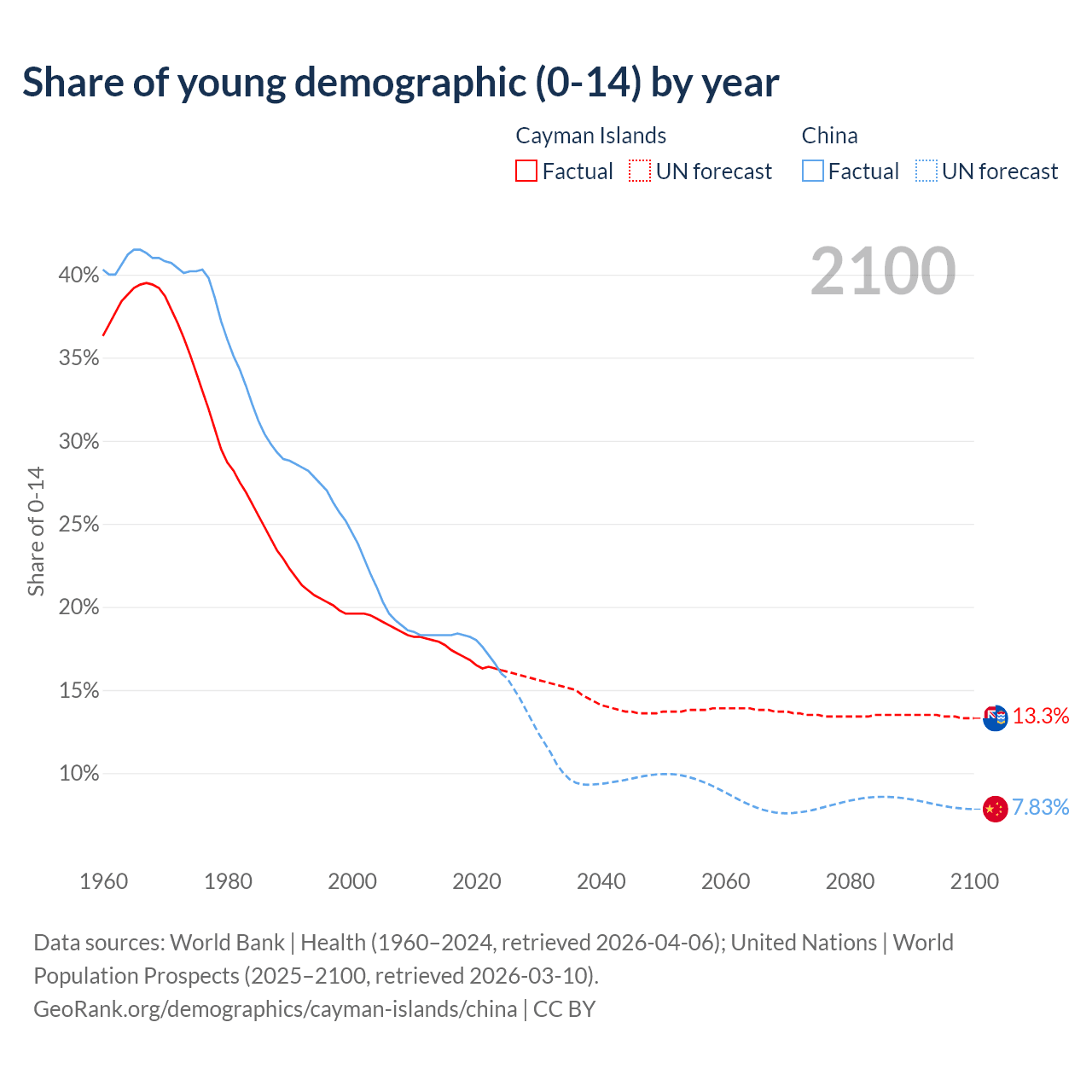 - As of 2026, the population of the Cayman Islands is 77.6K vs 1.4B in China - 18,070 times difference.