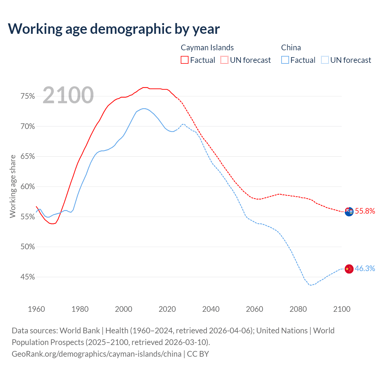 - The Cayman Islands has 58.1K working age adults (aged 15-64) vs 972M in China.