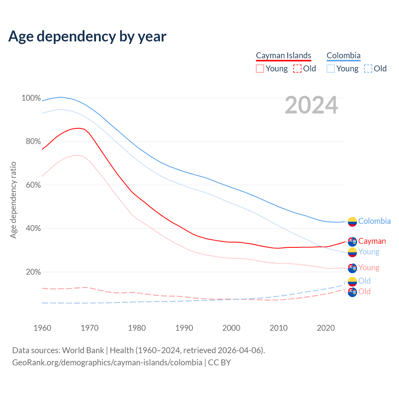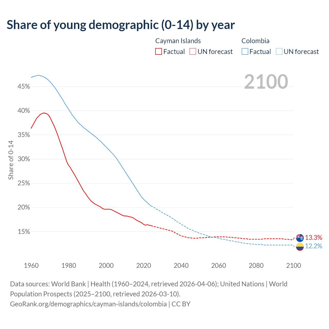 - The share of young demographic (0-15 years old) in the Cayman Islands is 16.2% vs 20.3% in Colombia.