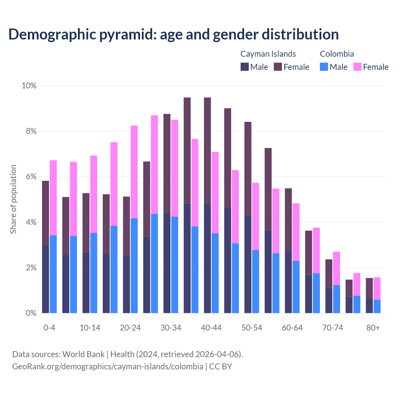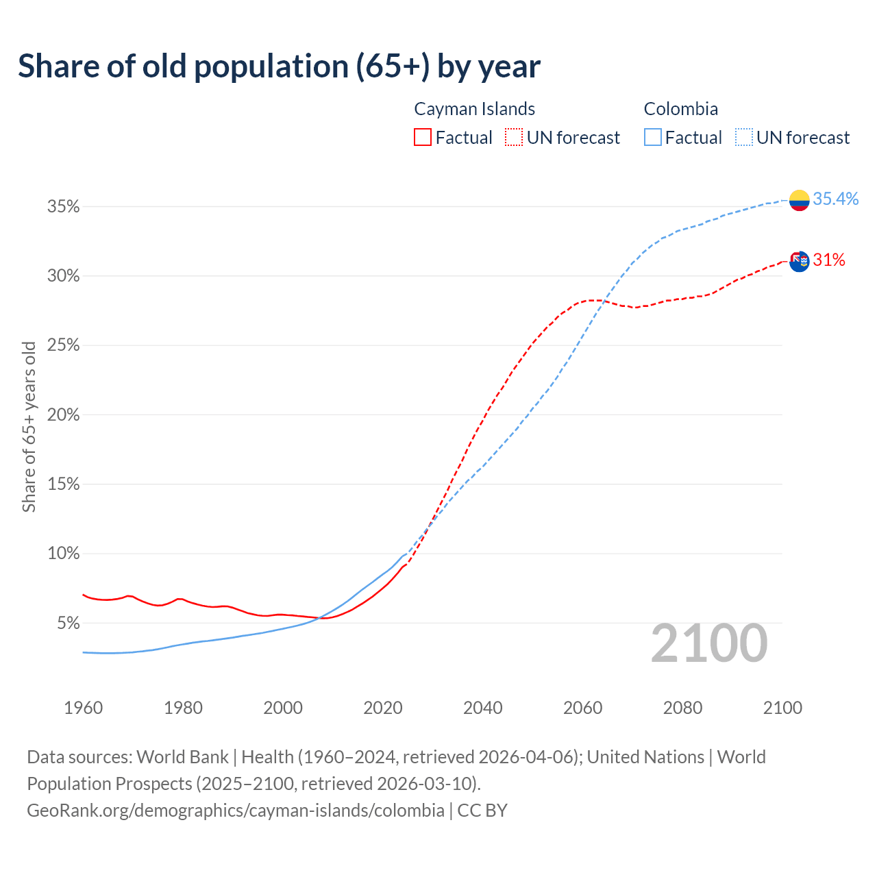 The share of older people aged 65 and over is 9% in the Cayman Islands and 9.78% in Colombia. Life expectancy in the Cayman Islands compared to Colombia .