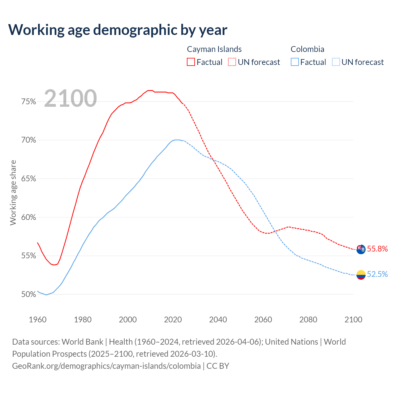 - The Cayman Islands has 58.1K working age adults (aged 15-64) vs 37.8M in Colombia.