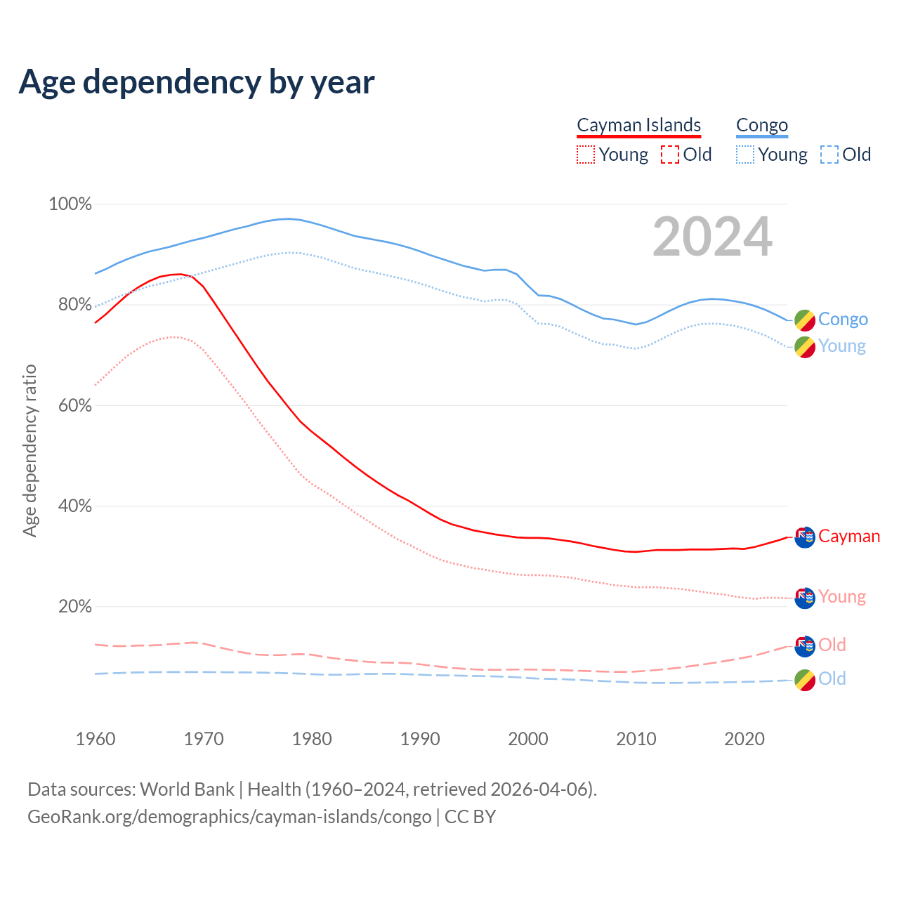 The share of older people aged 65 and over is 9% in the Cayman Islands and 2.99% in the Congo. Life expectancy in the Cayman Islands compared to the Congo .