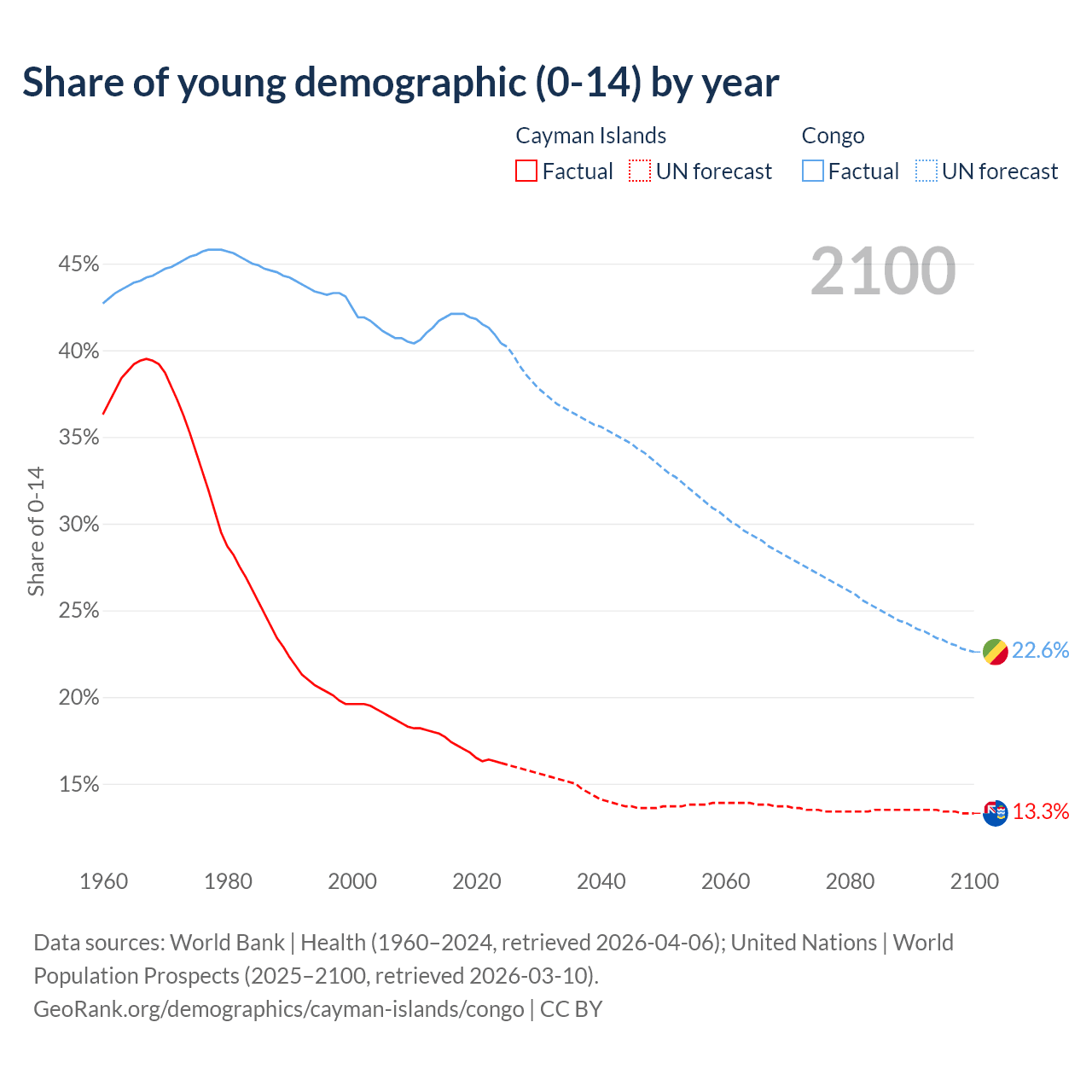 - The share of young demographic (0-15 years old) in the Cayman Islands is 16.2% vs 40.4% in the Congo.