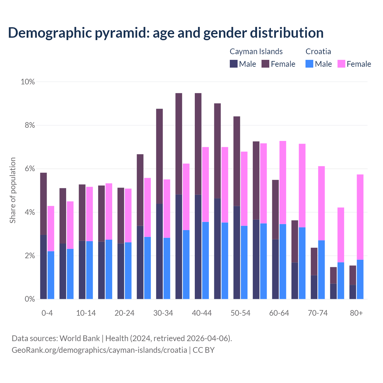 - The Cayman Islands is ranked 51/196 by median age (oldest to youngest) vs 11/196 for Croatia.