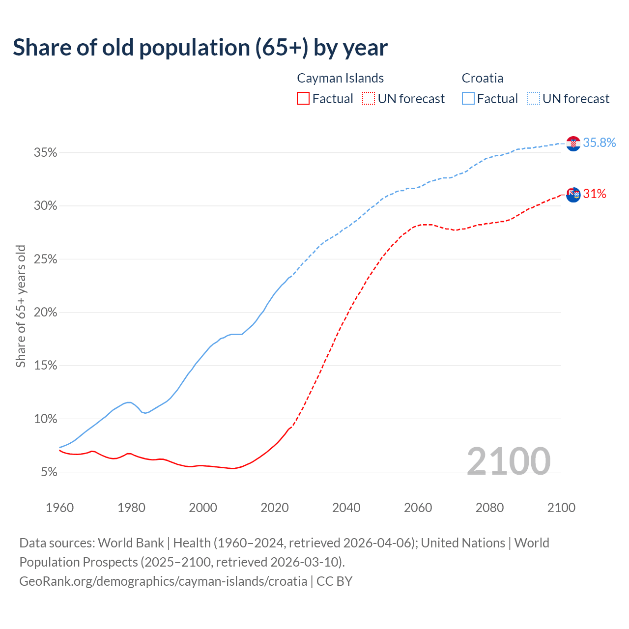 The share of older people aged 65 and over is 9% in the Cayman Islands and 23.2% in Croatia. Life expectancy in the Cayman Islands compared to Croatia .