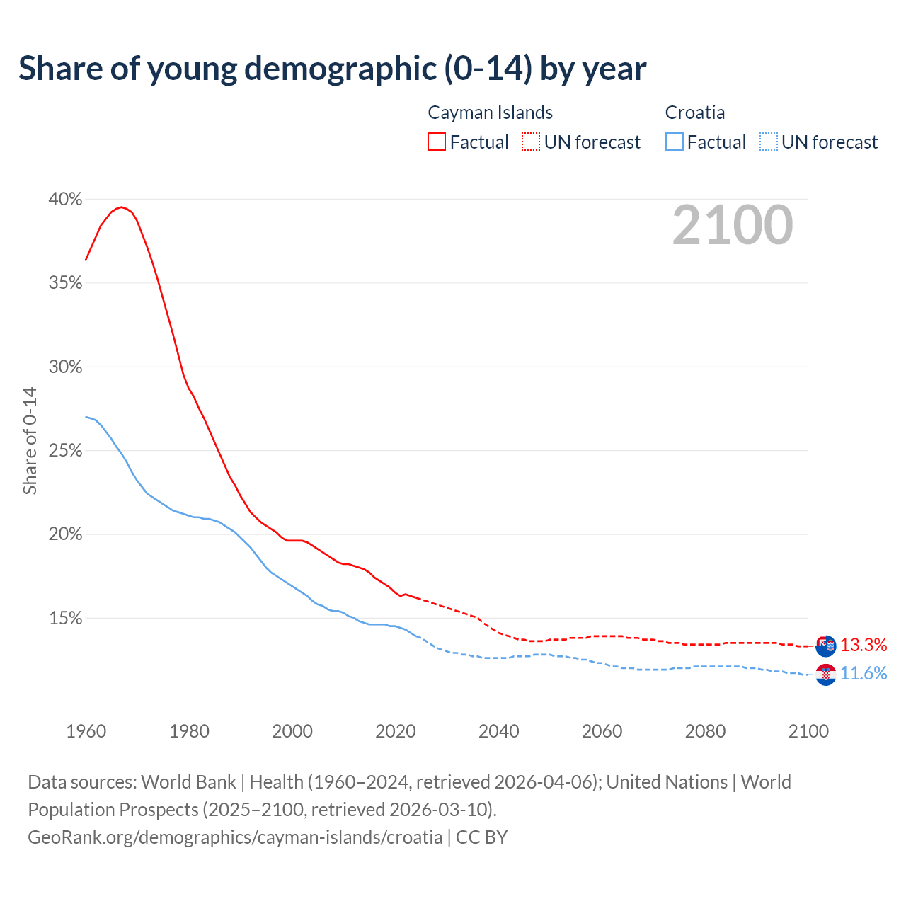 - The share of young demographic (0-15 years old) in the Cayman Islands is 16.2% vs 13.9% in Croatia.