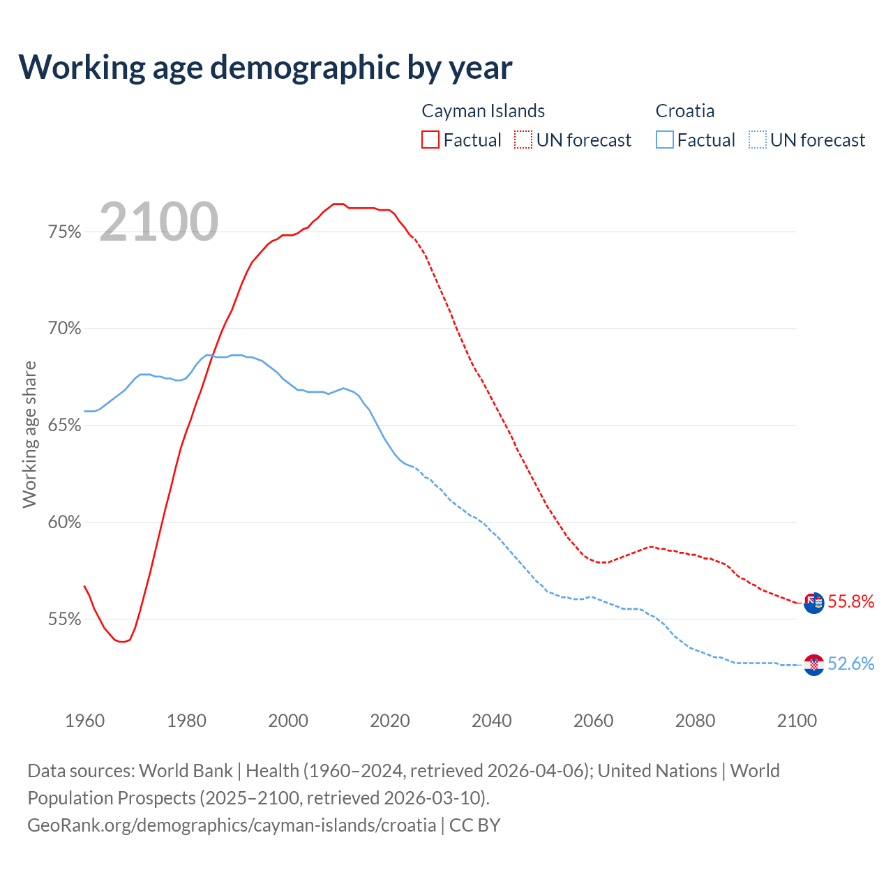- The Cayman Islands has 58.1K working age adults (aged 15-64) vs 2.4M in Croatia.