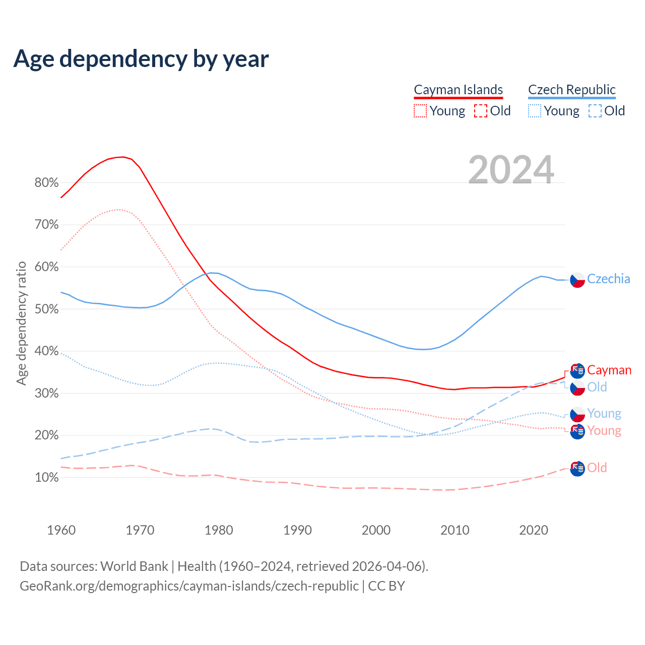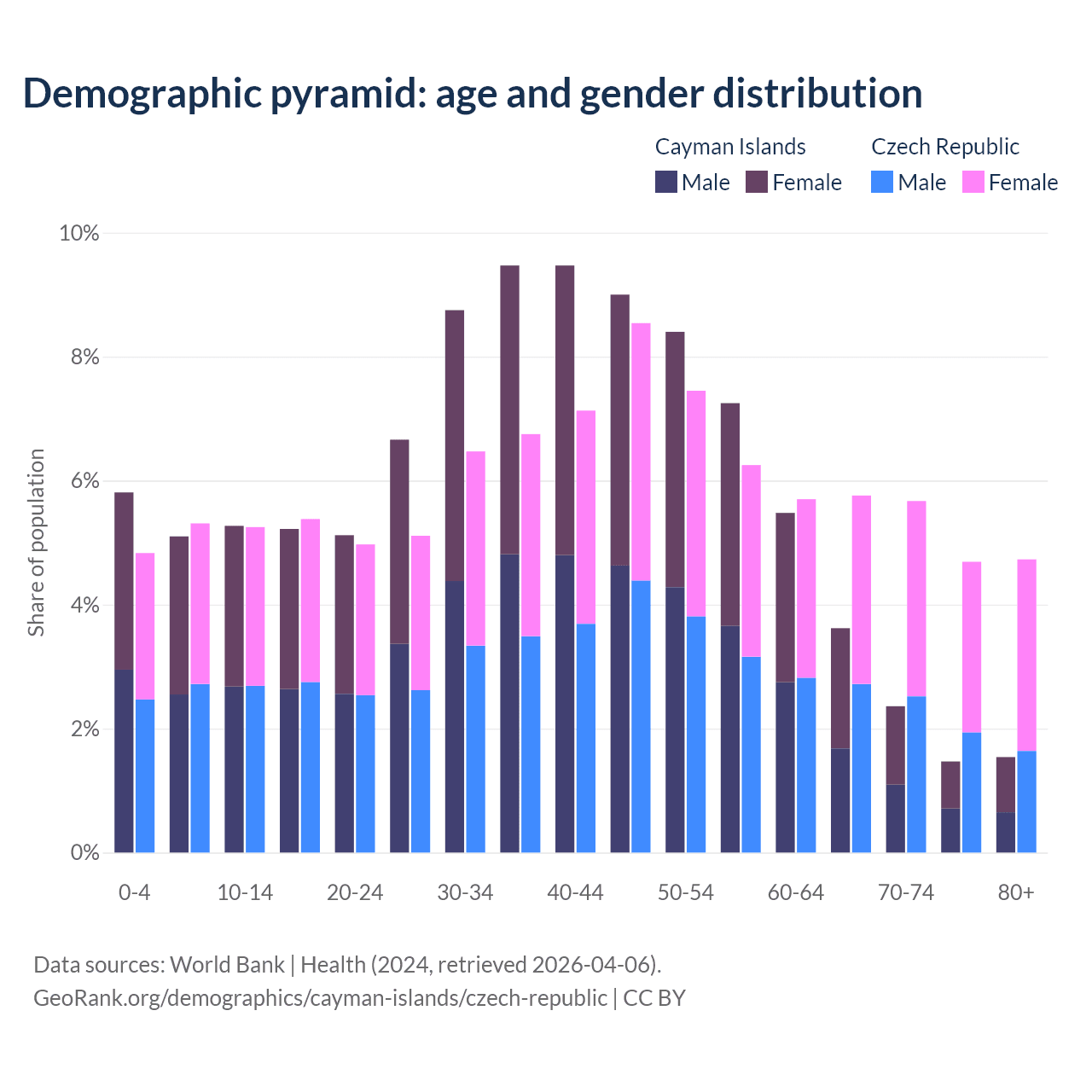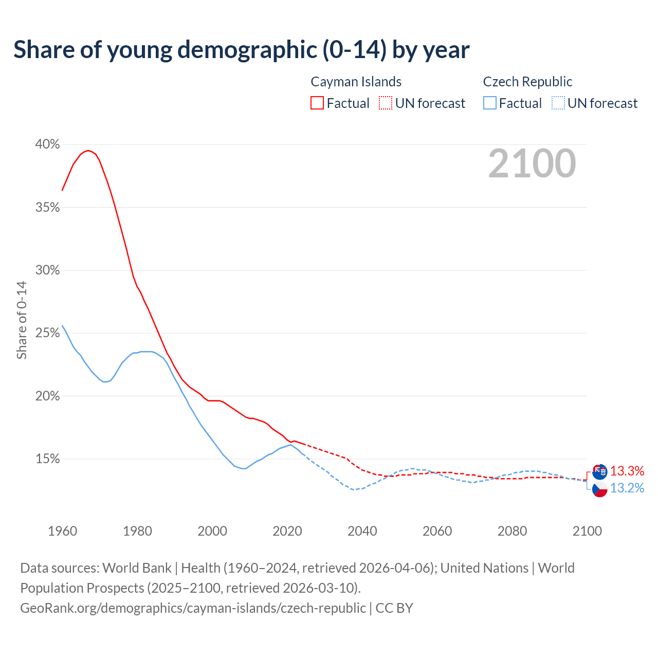- The share of young demographic (0-15 years old) in the Cayman Islands is 16.2% vs 15.4% in the Czech Republic.