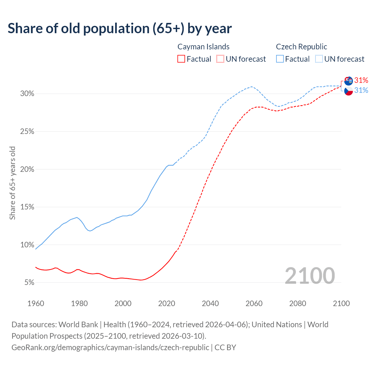 The share of older people aged 65 and over is 9% in the Cayman Islands and 20.8% in the Czech Republic. Life expectancy in the Cayman Islands compared to the Czech Republic .