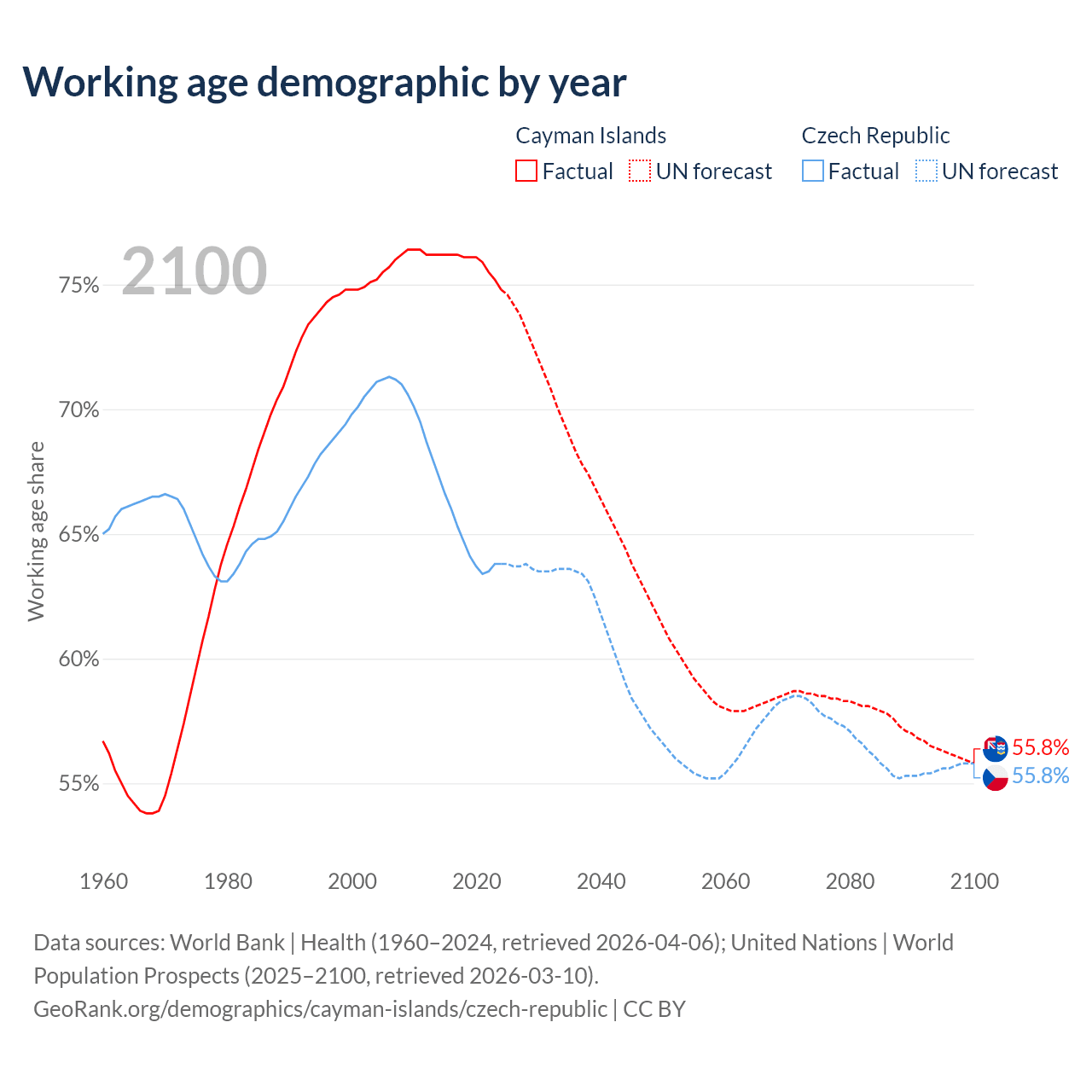 - The Cayman Islands has 58.1K working age adults (aged 15-64) vs 6.79M in the Czech Republic.
