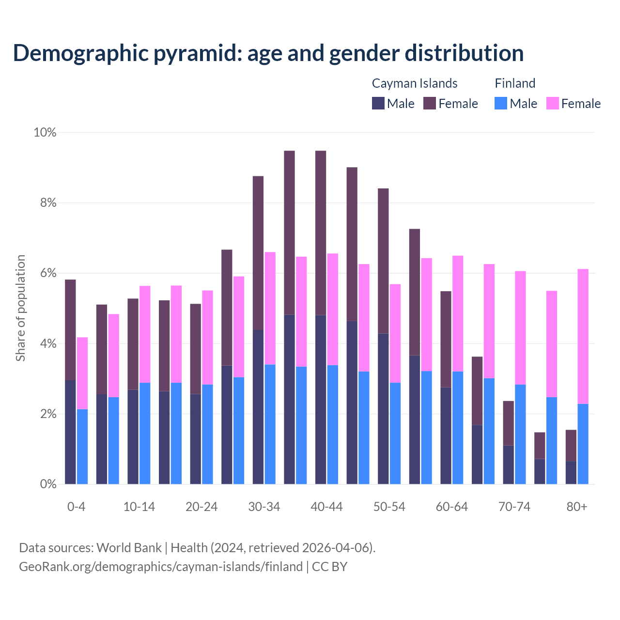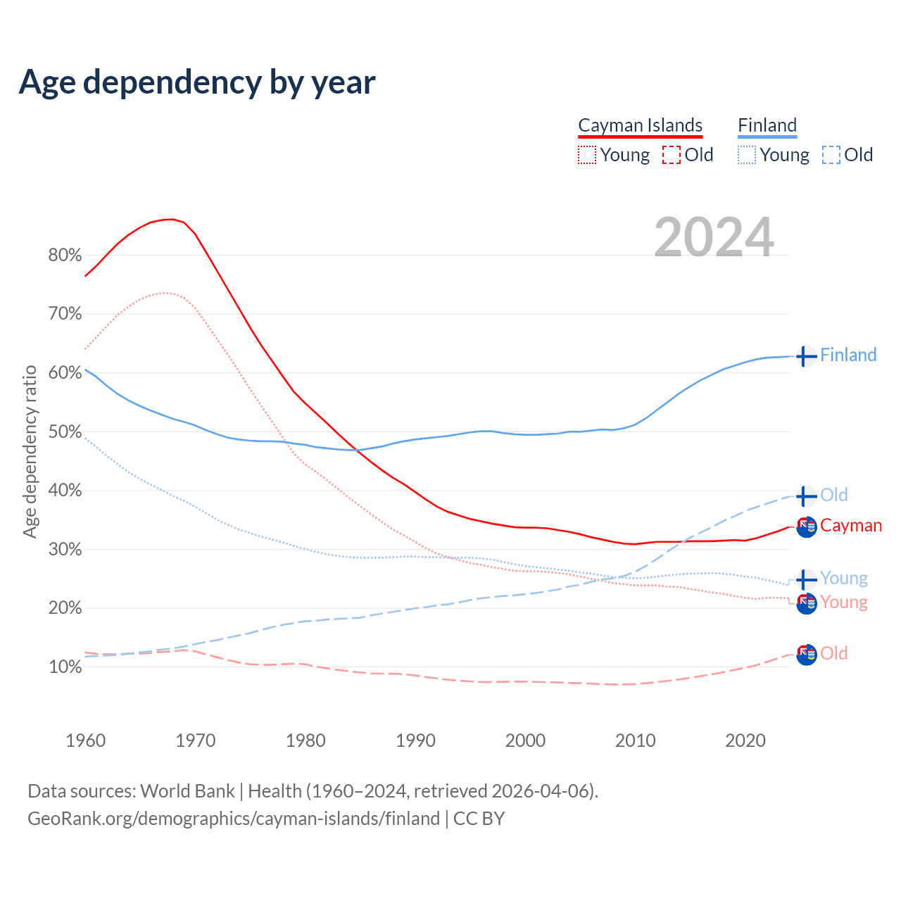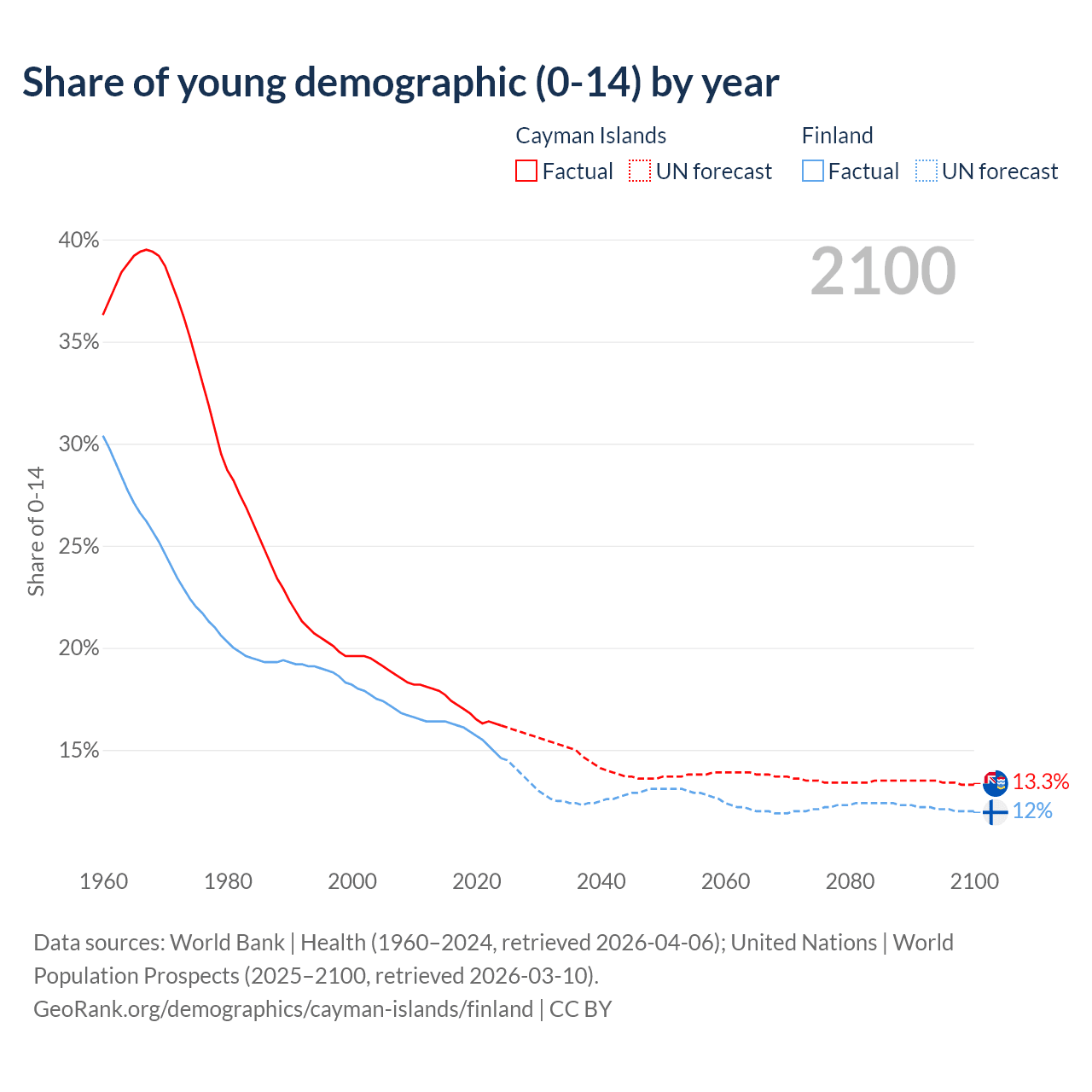 - The share of young demographic (0-15 years old) in the Cayman Islands is 16.2% vs 14.6% in Finland.