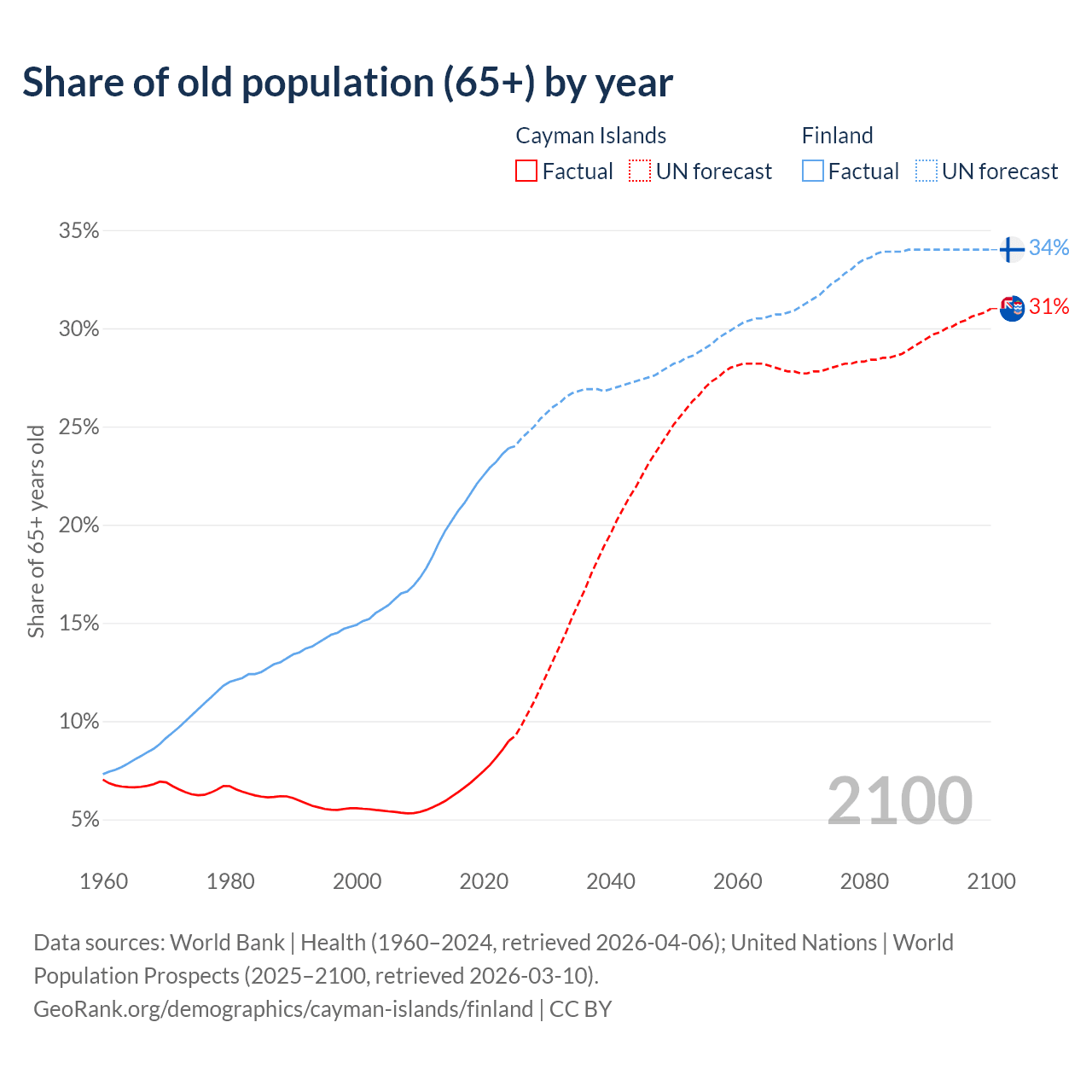 The share of older people aged 65 and over is 9% in the Cayman Islands and 23.9% in Finland. Life expectancy in the Cayman Islands compared to Finland .