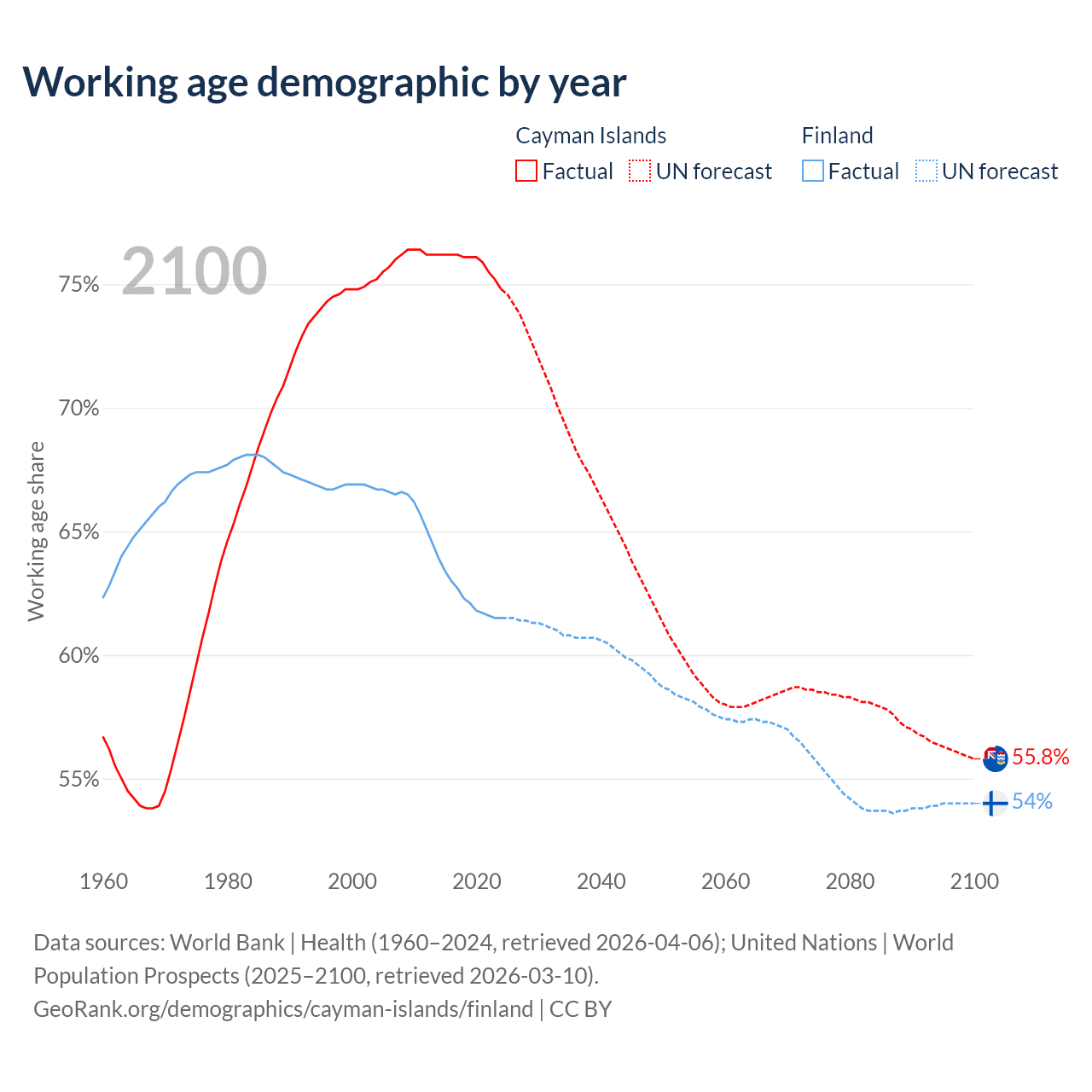 - The Cayman Islands has 58.1K working age adults (aged 15-64) vs 3.46M in Finland.