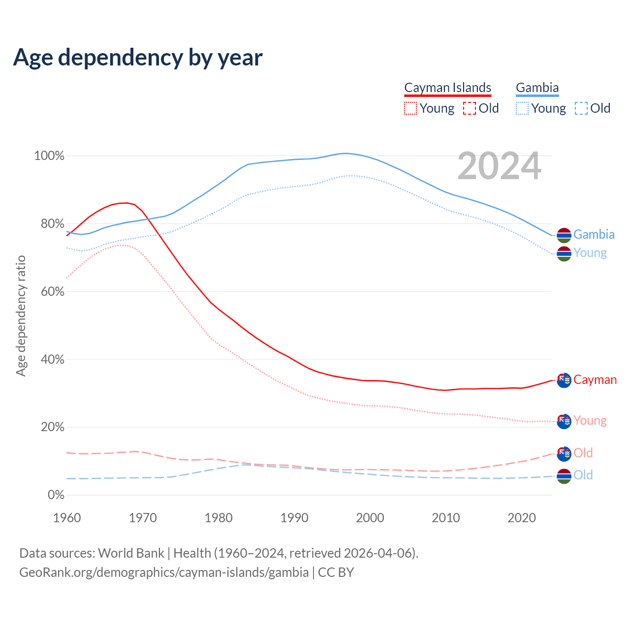 The share of older people aged 65 and over is 9% in the Cayman Islands and 3.08% in the Gambia. Life expectancy in the Cayman Islands compared to the Gambia .
