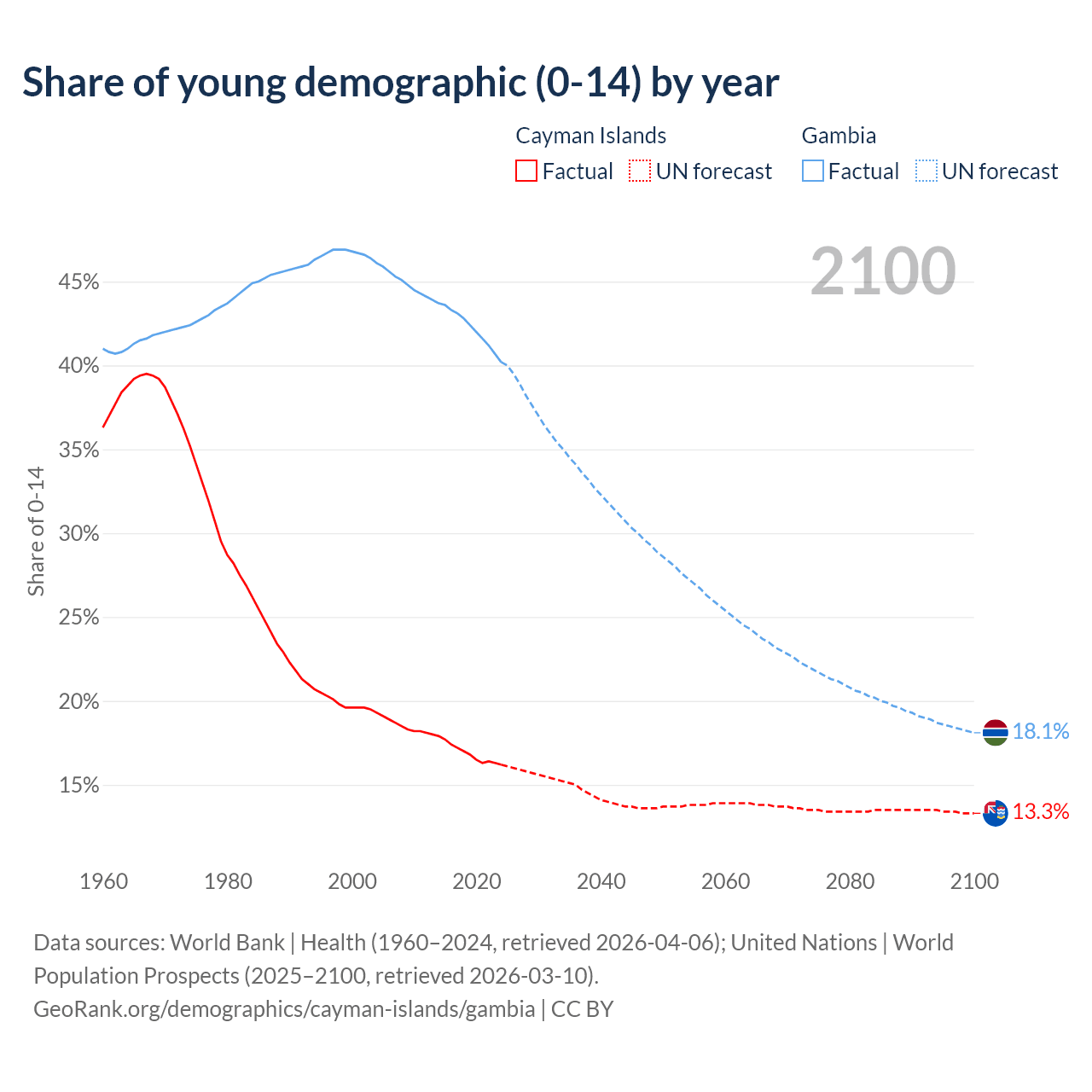 - The share of young demographic (0-15 years old) in the Cayman Islands is 16.2% vs 40.2% in the Gambia.