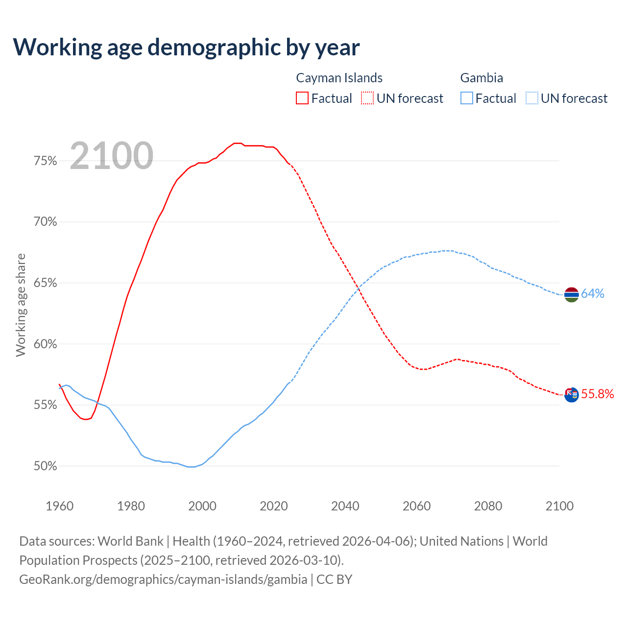 - The Cayman Islands has 58.1K working age adults (aged 15-64) vs 1.64M in the Gambia.
