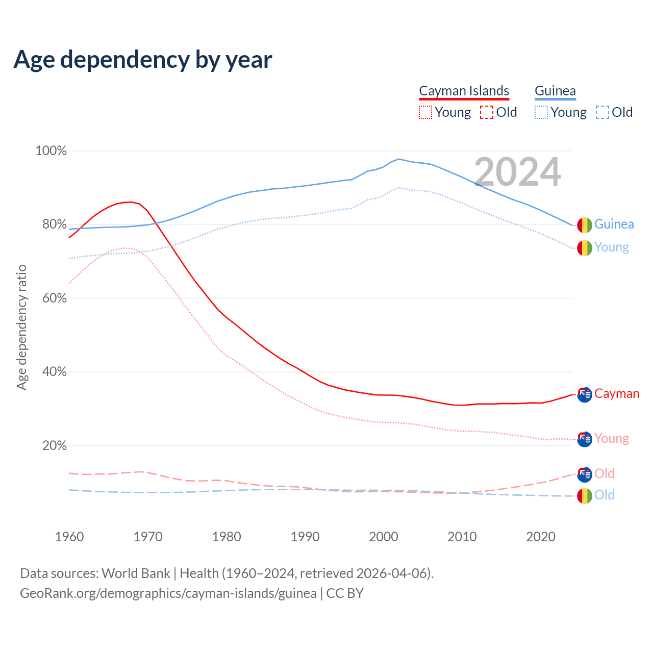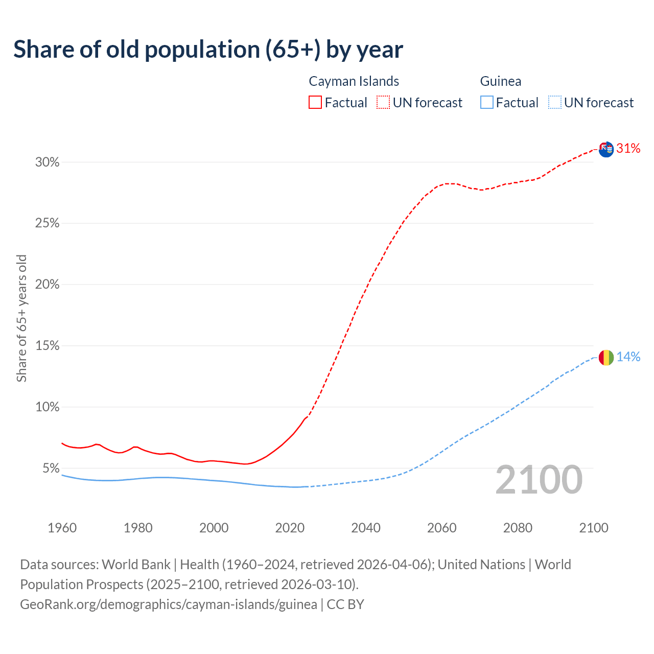 The share of older people aged 65 and over is 9% in the Cayman Islands and 3.46% in Guinea. Life expectancy in the Cayman Islands compared to Guinea .