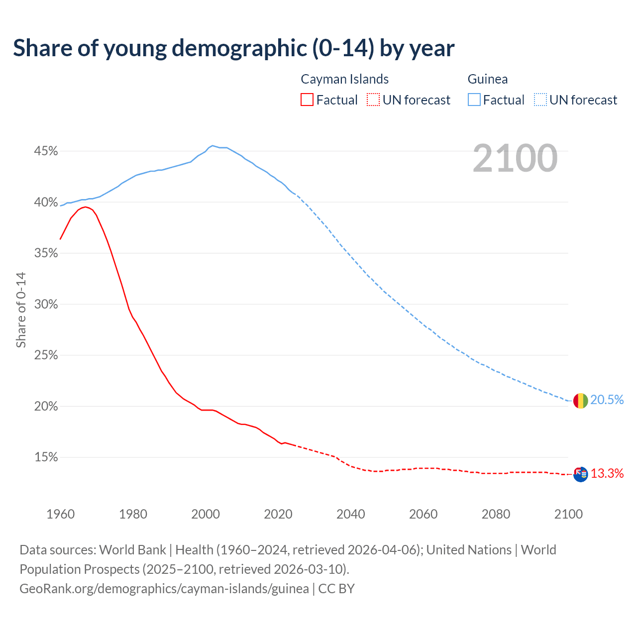 - The share of young demographic (0-15 years old) in the Cayman Islands is 16.2% vs 40.9% in Guinea.