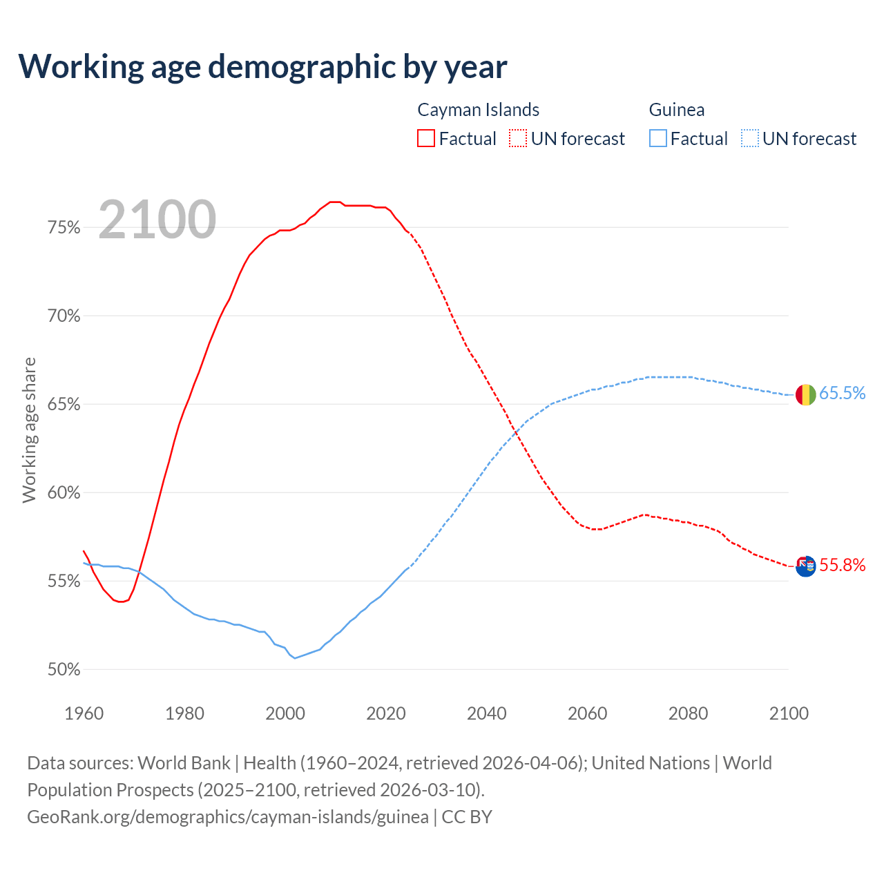 - The Cayman Islands has 58.1K working age adults (aged 15-64) vs 8.65M in Guinea.