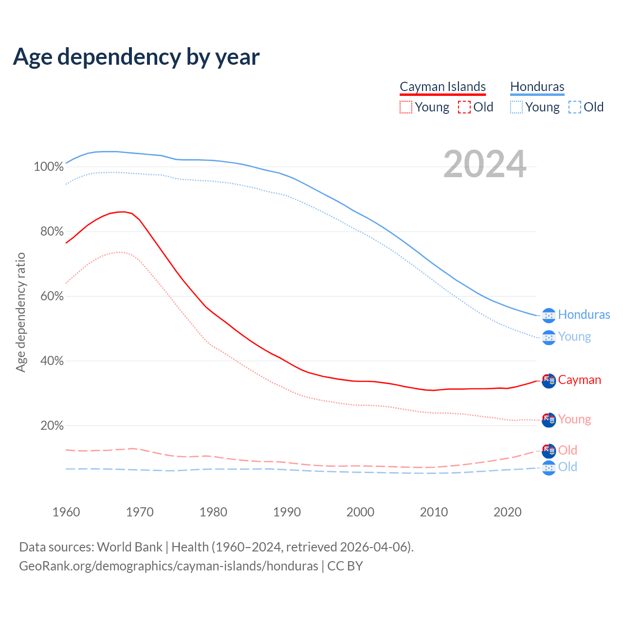 The share of older people aged 65 and over is 9% in the Cayman Islands and 4.42% in Honduras. Life expectancy in the Cayman Islands compared to Honduras .