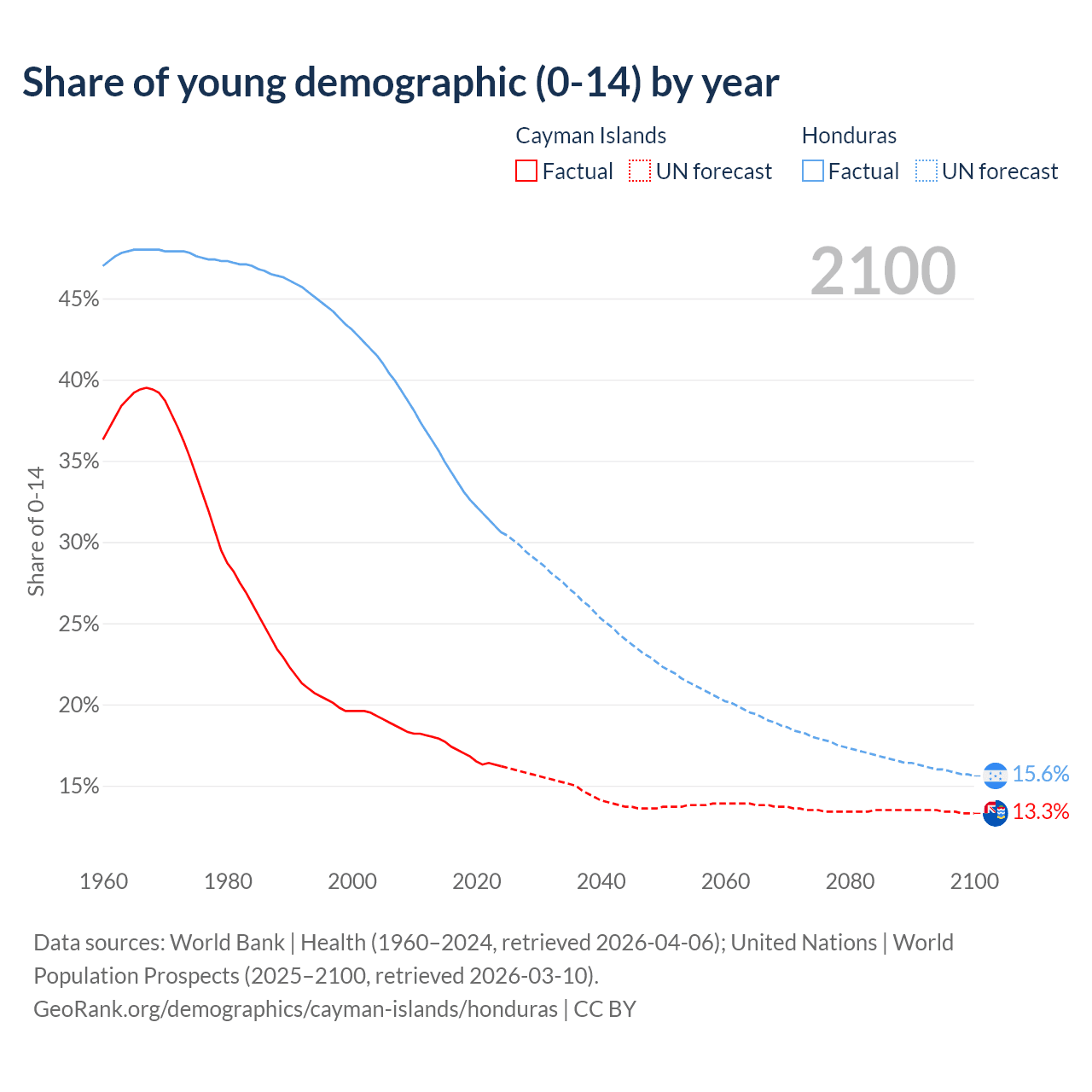 - The share of young demographic (0-15 years old) in the Cayman Islands is 16.2% vs 30.6% in Honduras.