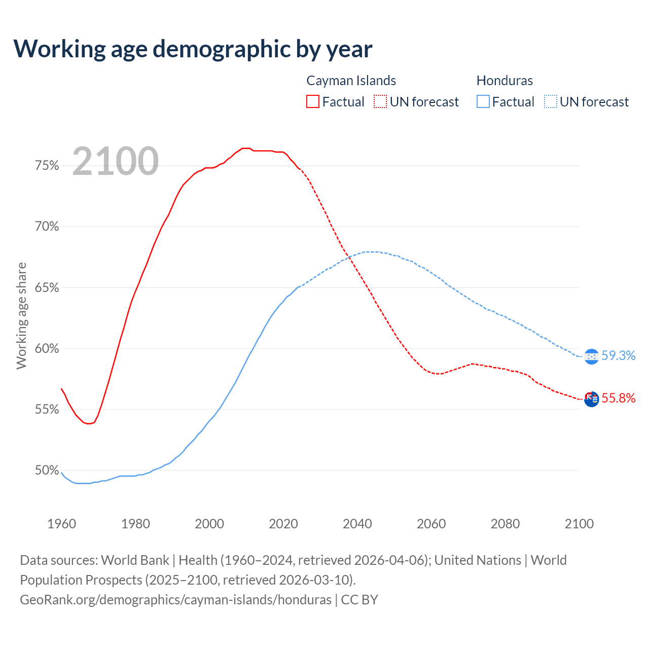 - The Cayman Islands has 58.1K working age adults (aged 15-64) vs 7.3M in Honduras.