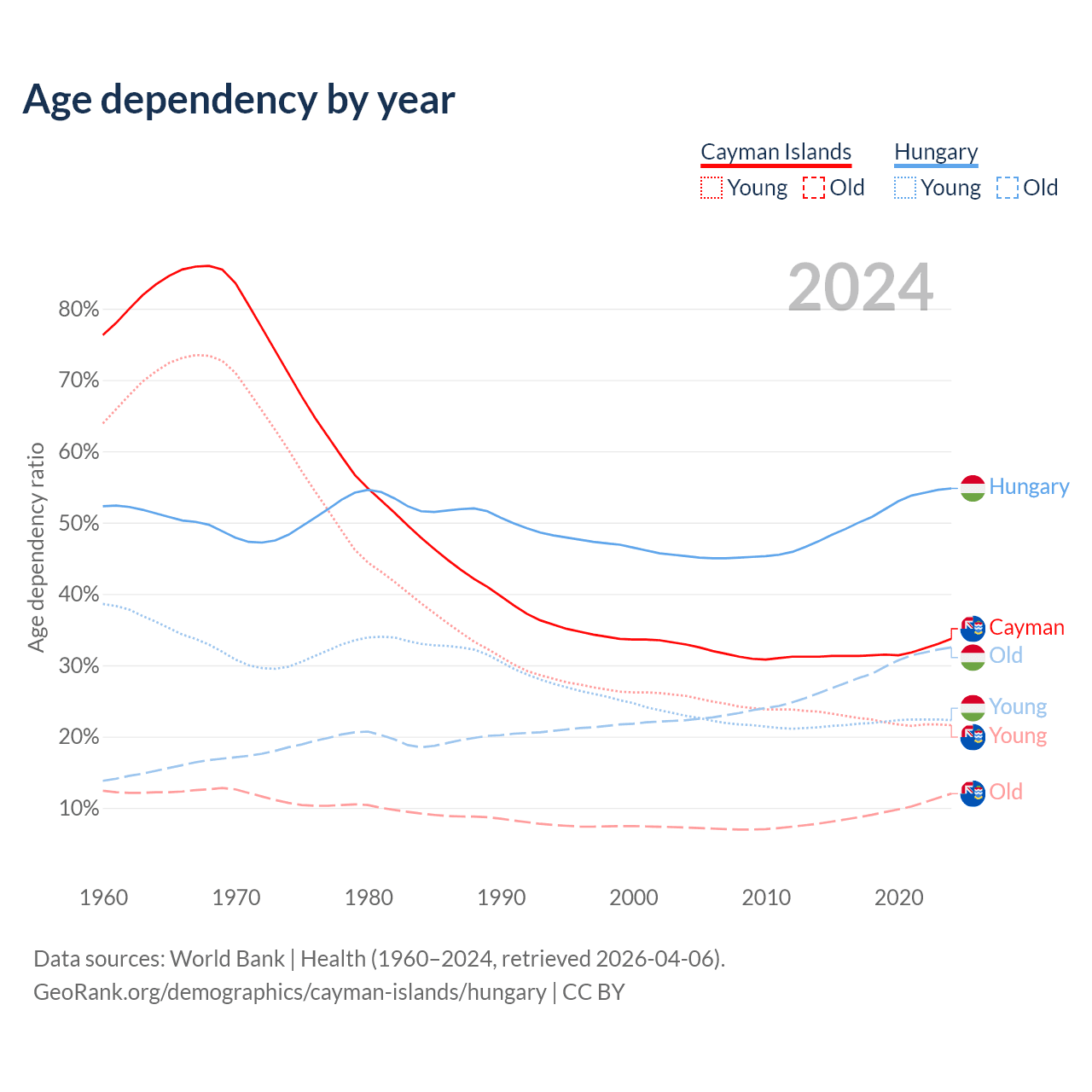 - The share of young demographic (0-15 years old) in the Cayman Islands is 16.2% vs 14.4% in Hungary.