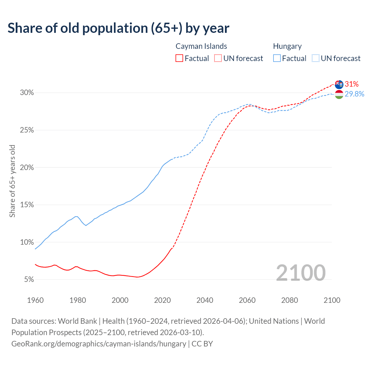 The share of older people aged 65 and over is 9% in the Cayman Islands and 21% in Hungary. Life expectancy in the Cayman Islands compared to Hungary .