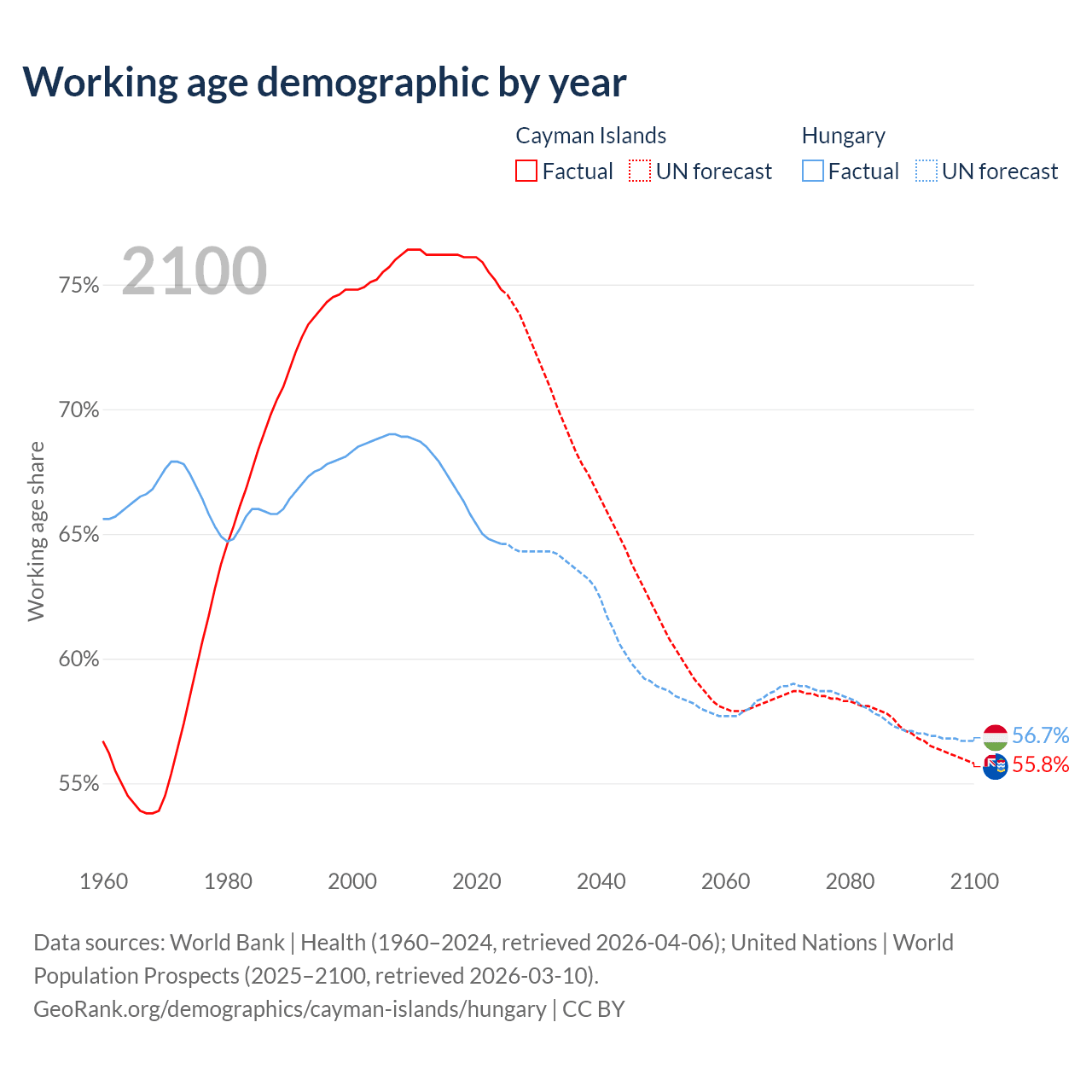 - The Cayman Islands has 58.1K working age adults (aged 15-64) vs 6.12M in Hungary.