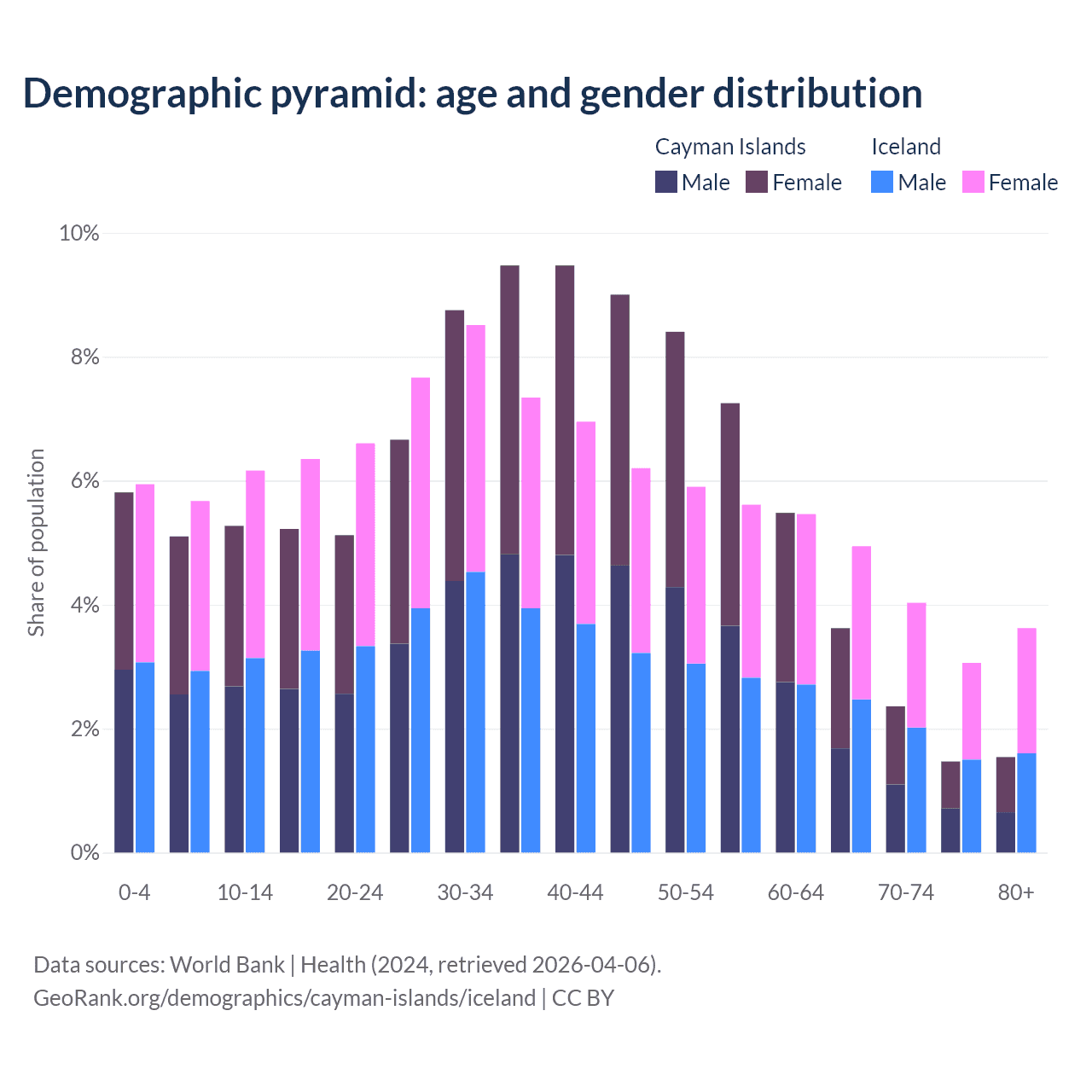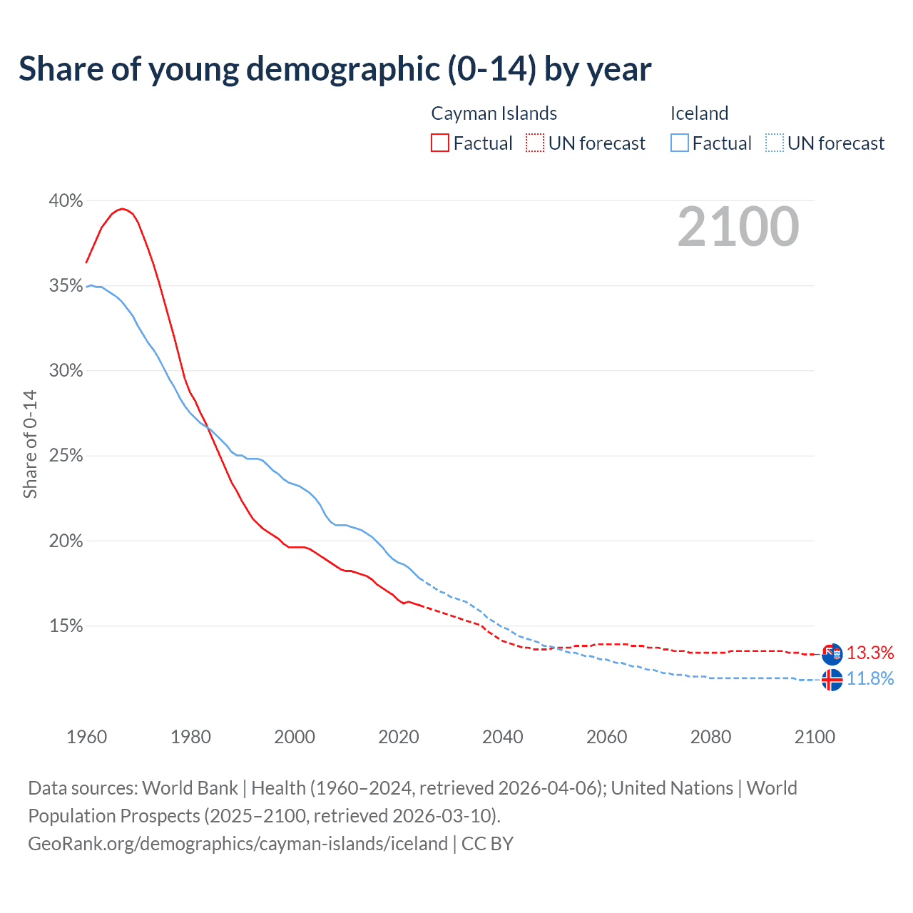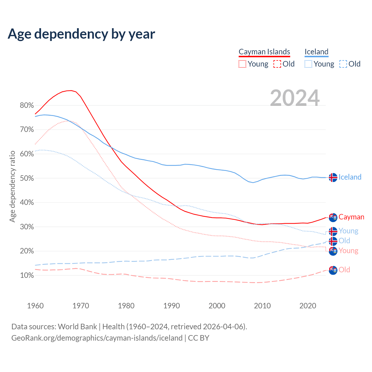 - The share of young demographic (0-15 years old) in the Cayman Islands is 16.2% vs 17.8% in Iceland.