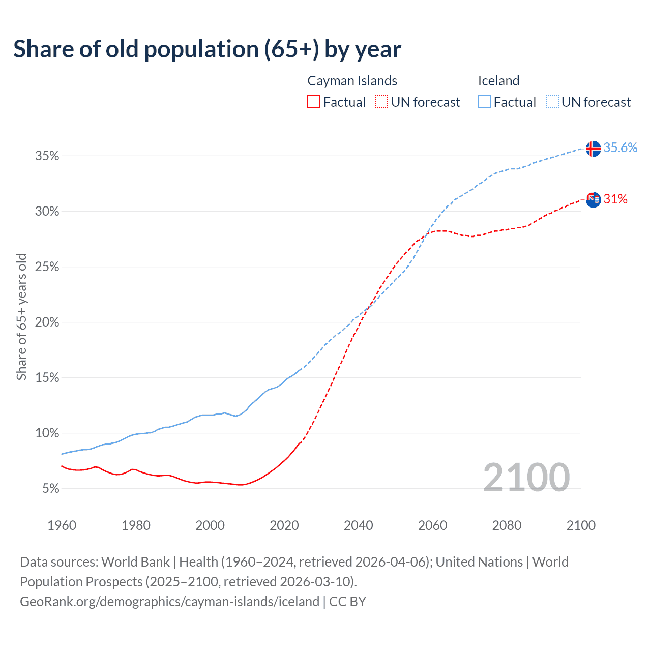 The share of older people aged 65 and over is 9% in the Cayman Islands and 15.6% in Iceland. Life expectancy in the Cayman Islands compared to Iceland .