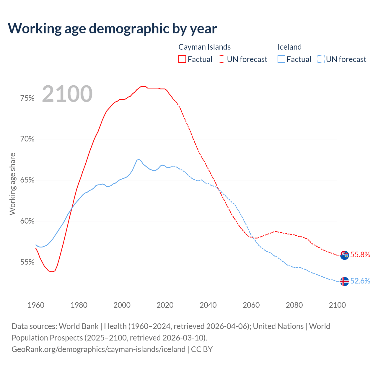 - The Cayman Islands has 58.1K working age adults (aged 15-64) vs 264K in Iceland.