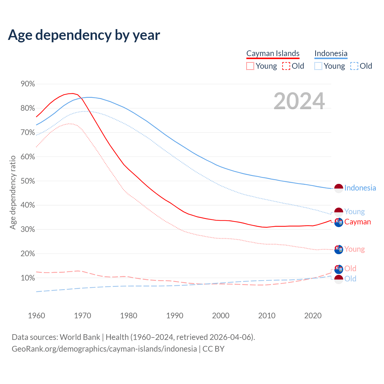 - The Cayman Islands is ranked 51/196 by median age (oldest to youngest) vs 93/196 for Indonesia.