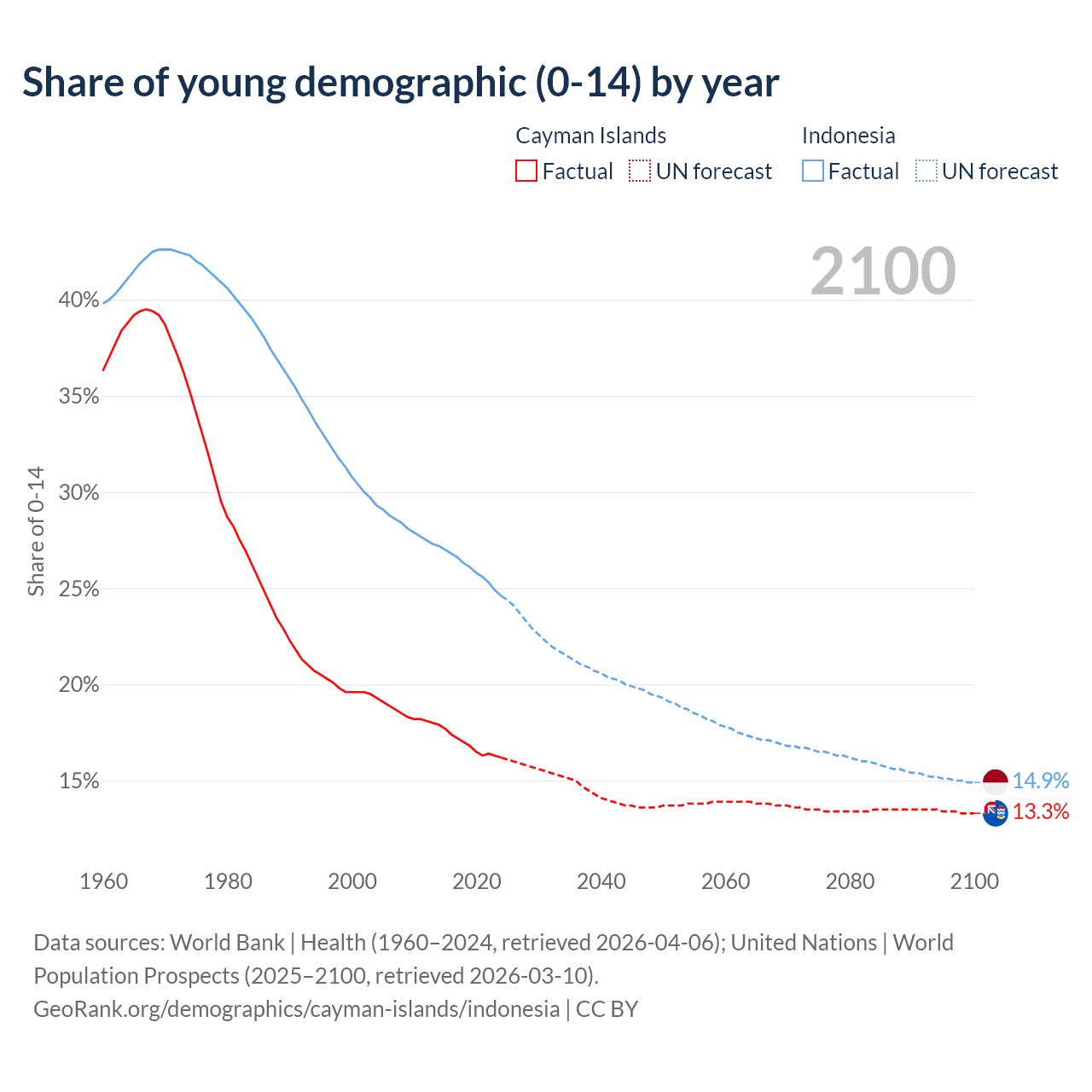 - The share of young demographic (0-15 years old) in the Cayman Islands is 16.2% vs 24.6% in Indonesia.