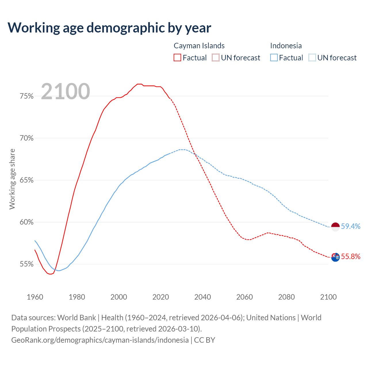 - The Cayman Islands has 58.1K working age adults (aged 15-64) vs 197M in Indonesia.