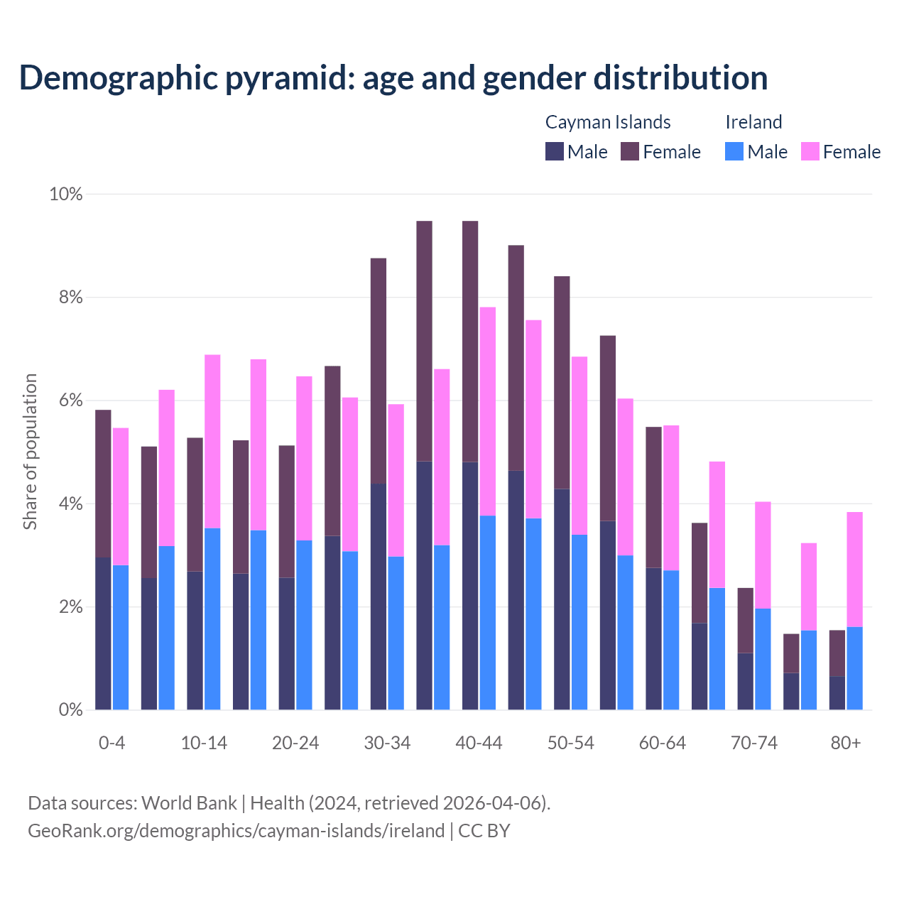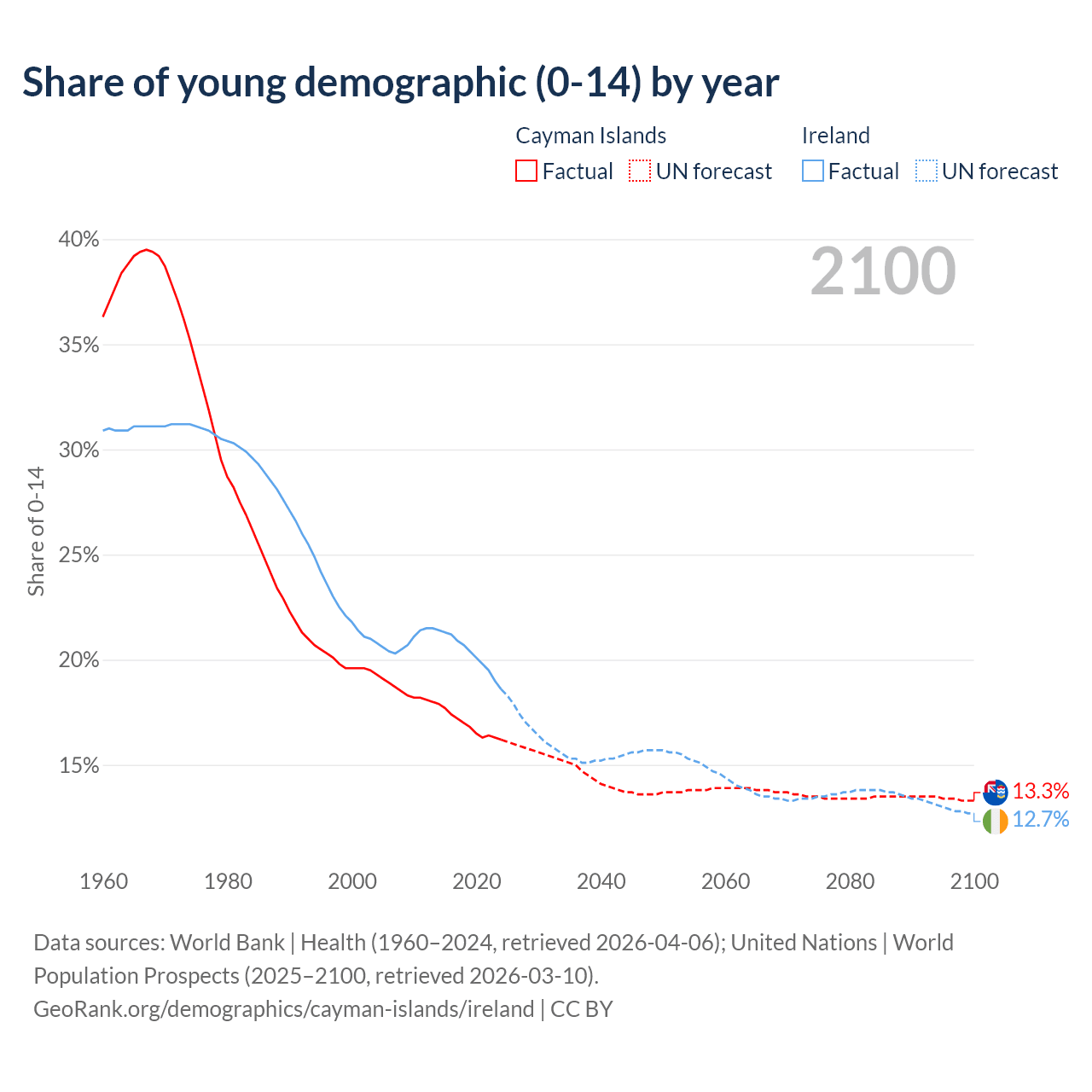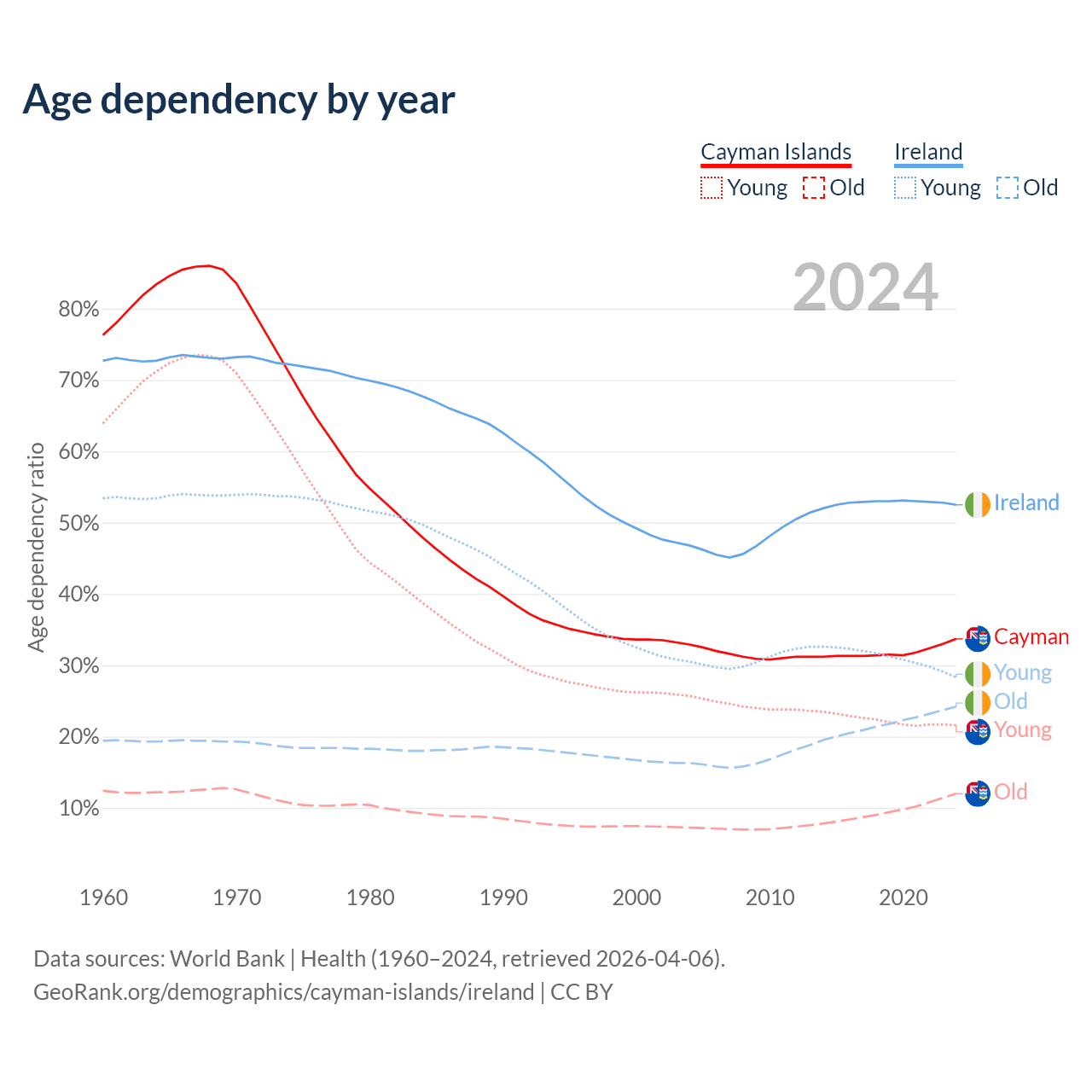 - The share of young demographic (0-15 years old) in the Cayman Islands is 16.2% vs 18.6% in Ireland.