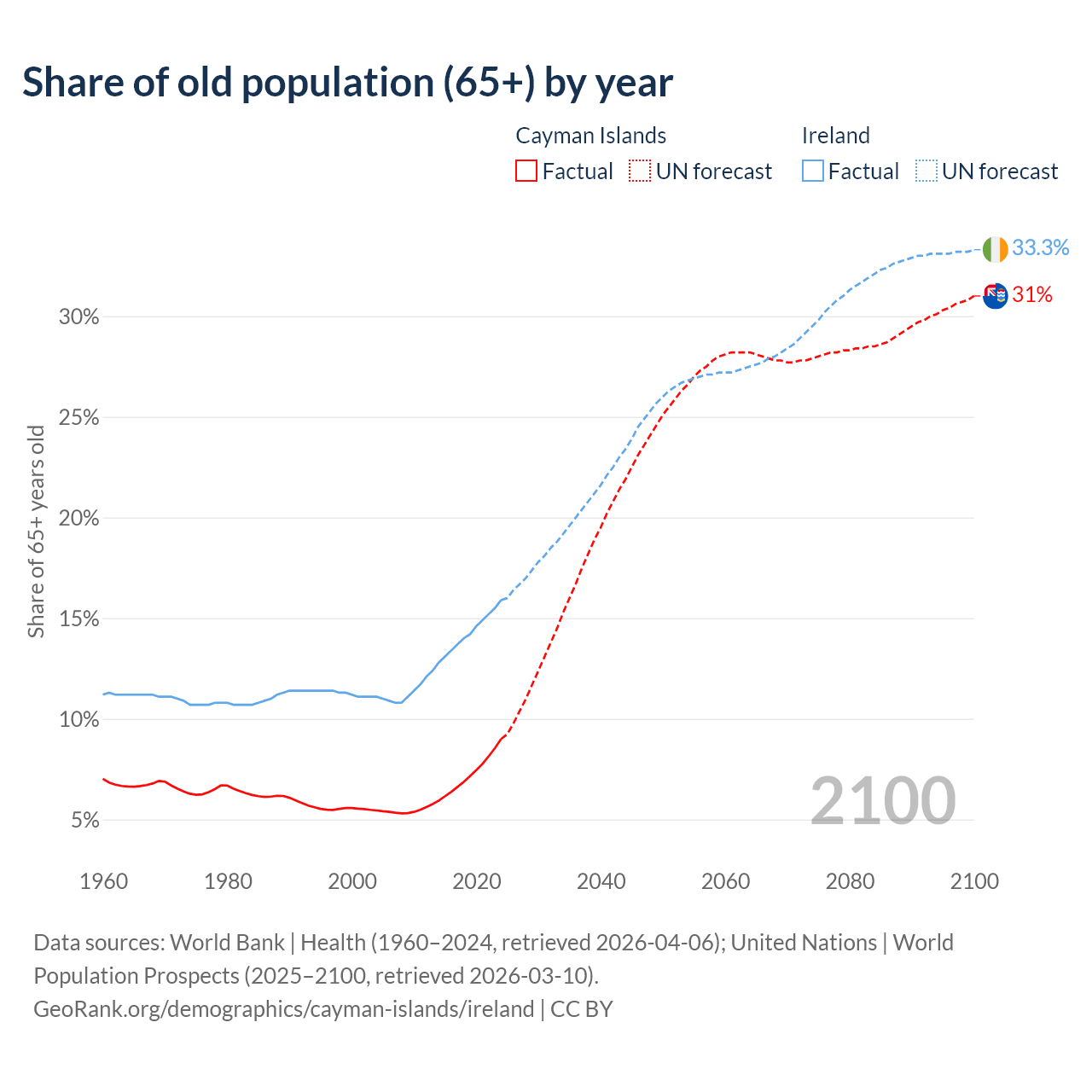 The share of older people aged 65 and over is 9% in the Cayman Islands and 15.9% in Ireland. Life expectancy in the Cayman Islands compared to Ireland .
