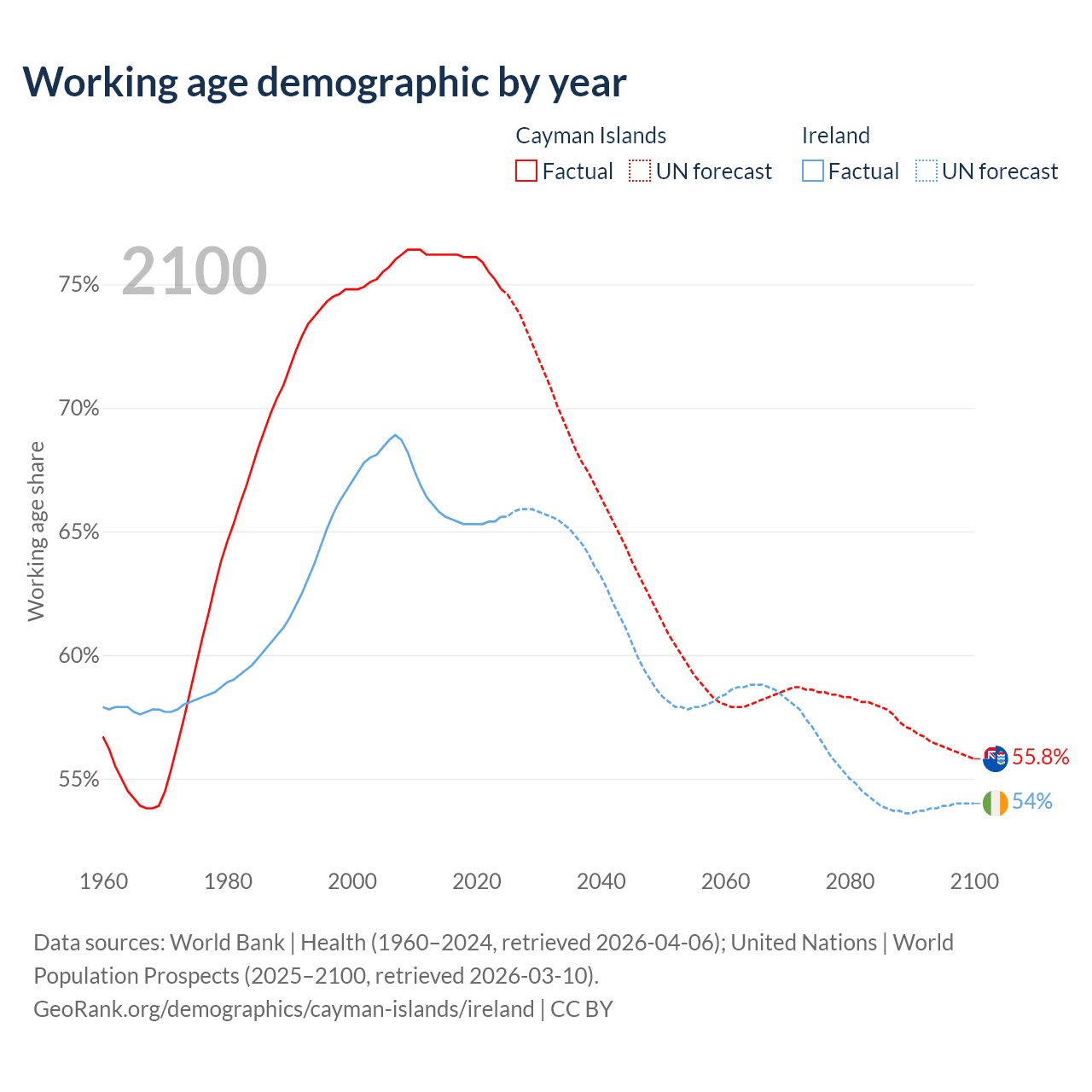 - The Cayman Islands has 58.1K working age adults (aged 15-64) vs 3.62M in Ireland.