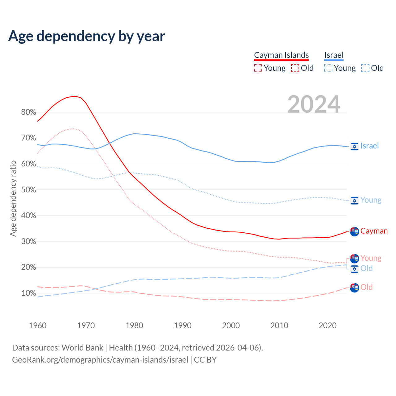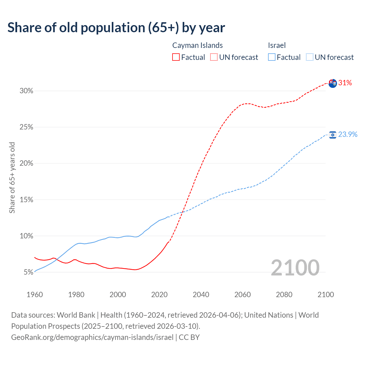 The share of older people aged 65 and over is 9% in the Cayman Islands and 12.6% in Israel. Life expectancy in the Cayman Islands compared to Israel .