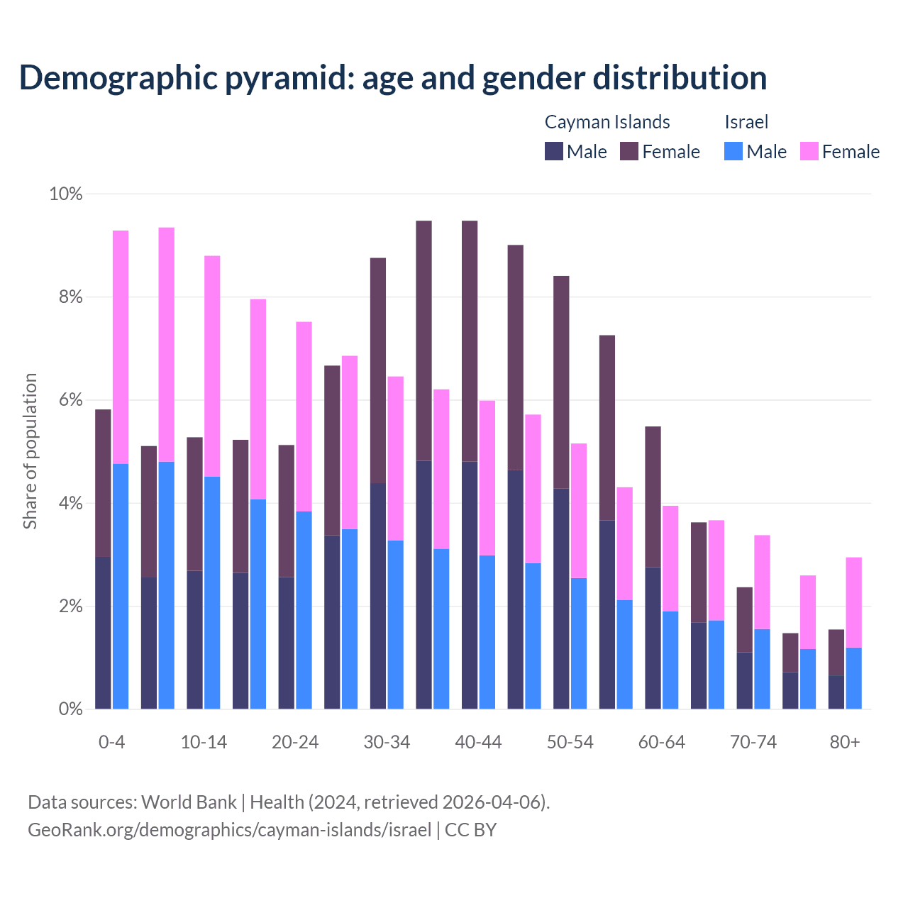 - As of 2026, the population of the Cayman Islands is 77.6K vs 10.3M in Israel - 132.6 times difference.