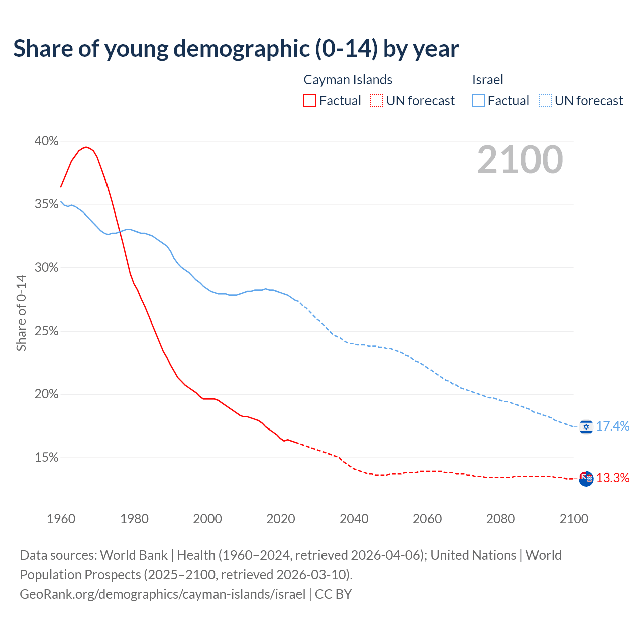 - The share of young demographic (0-15 years old) in the Cayman Islands is 16.2% vs 27.4% in Israel.