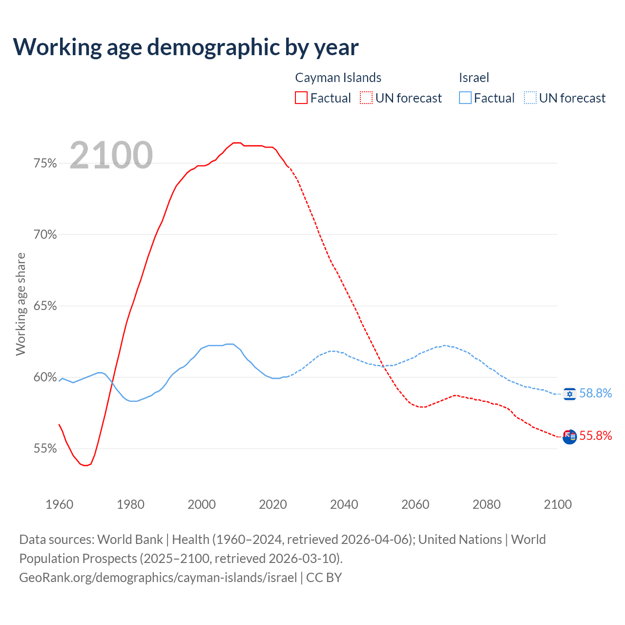 - The Cayman Islands has 58.1K working age adults (aged 15-64) vs 6.18M in Israel.