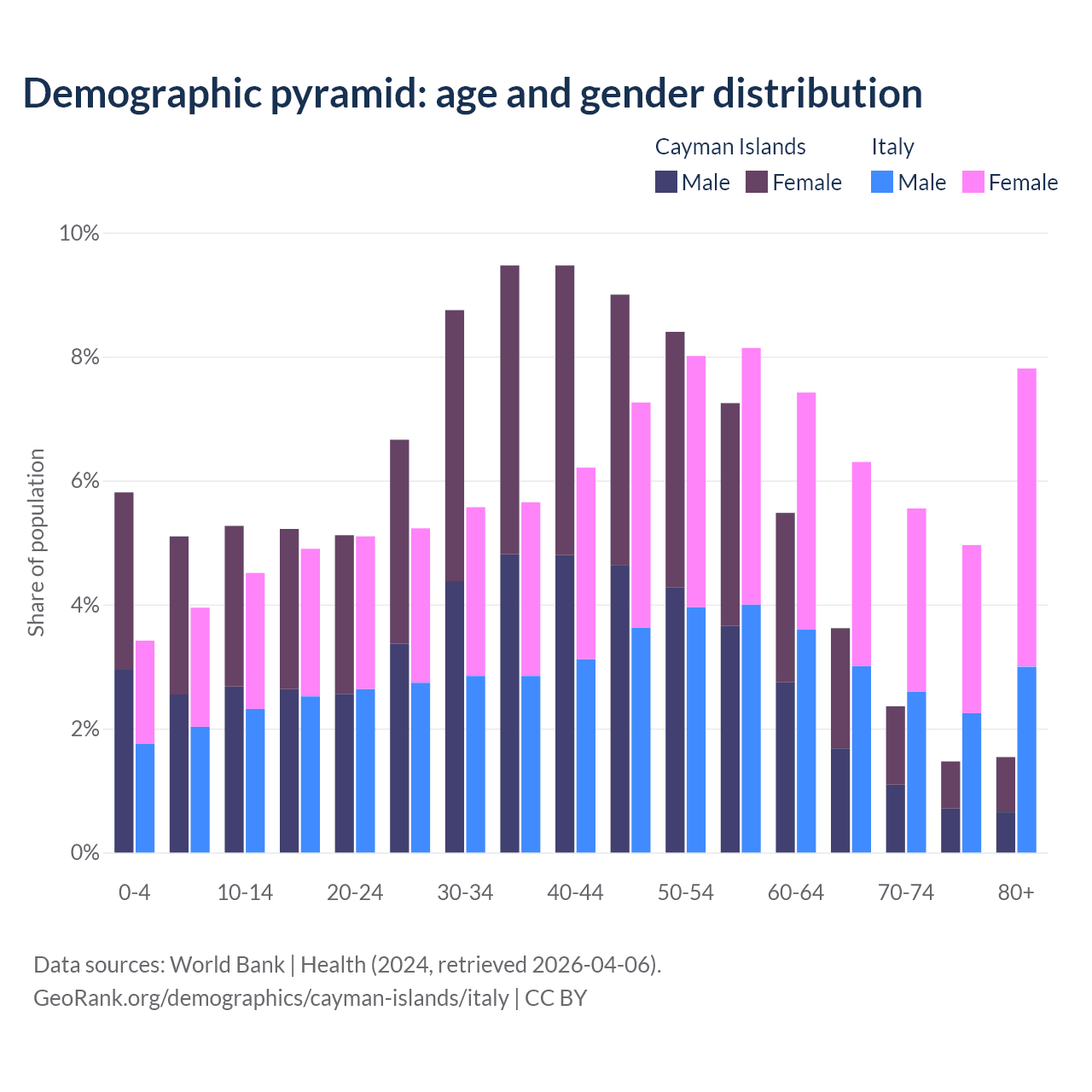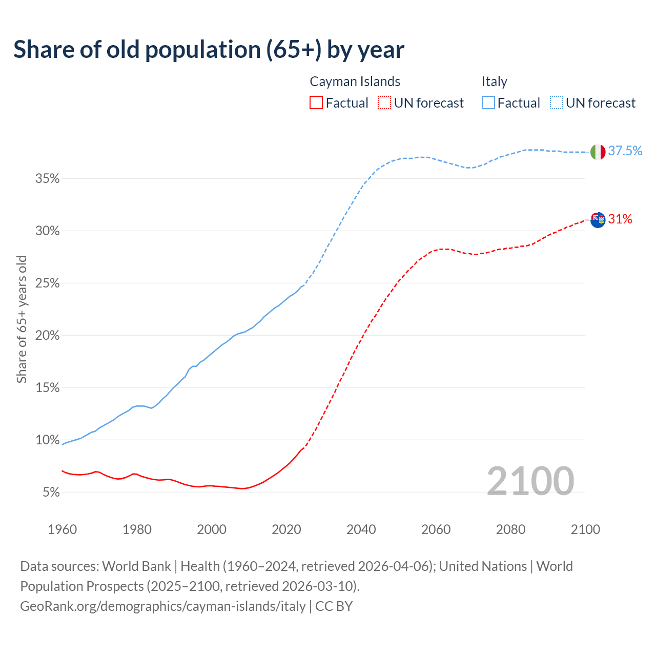 The share of older people aged 65 and over is 9% in the Cayman Islands and 24.6% in Italy. Life expectancy in the Cayman Islands compared to Italy .
