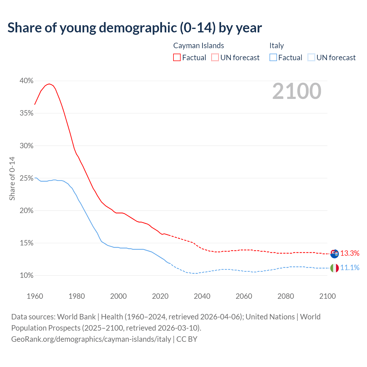 - The share of young demographic (0-15 years old) in the Cayman Islands is 16.2% vs 11.9% in Italy.