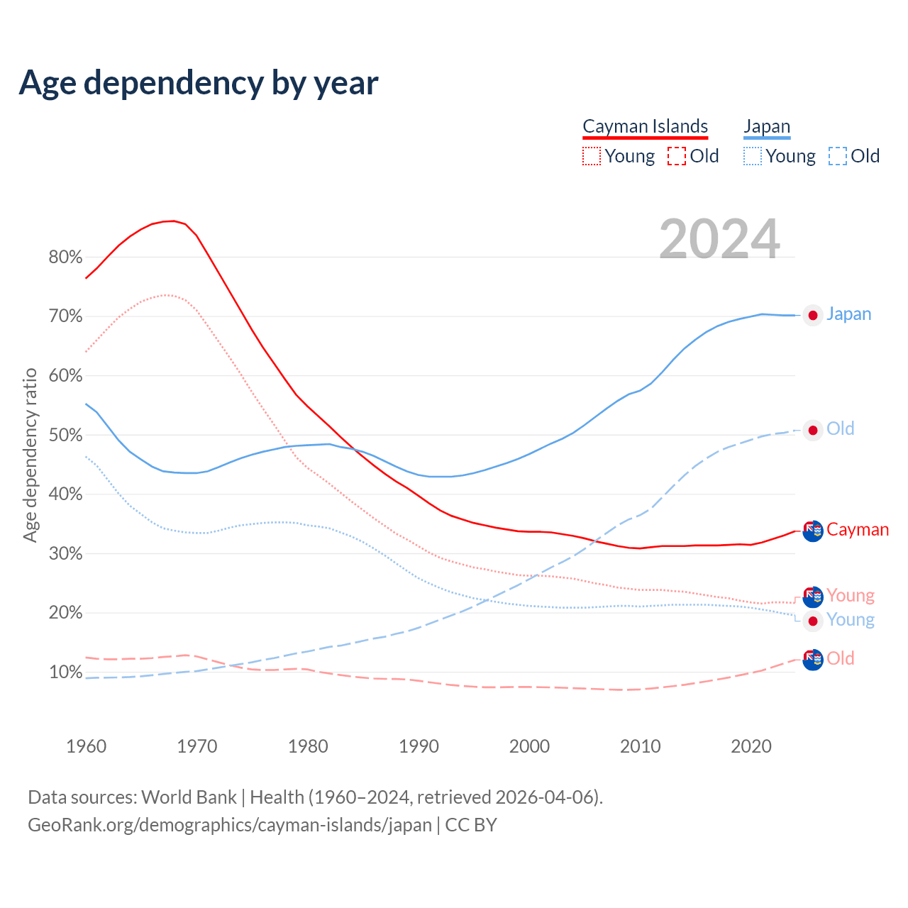 - The Cayman Islands is ranked 51/196 by median age (oldest to youngest) vs 2/196 for Japan.