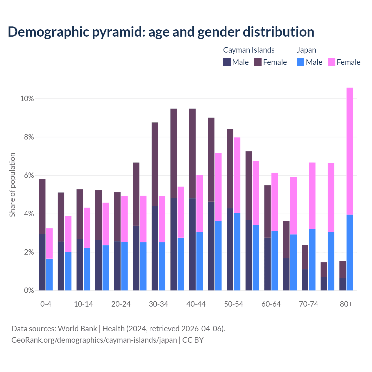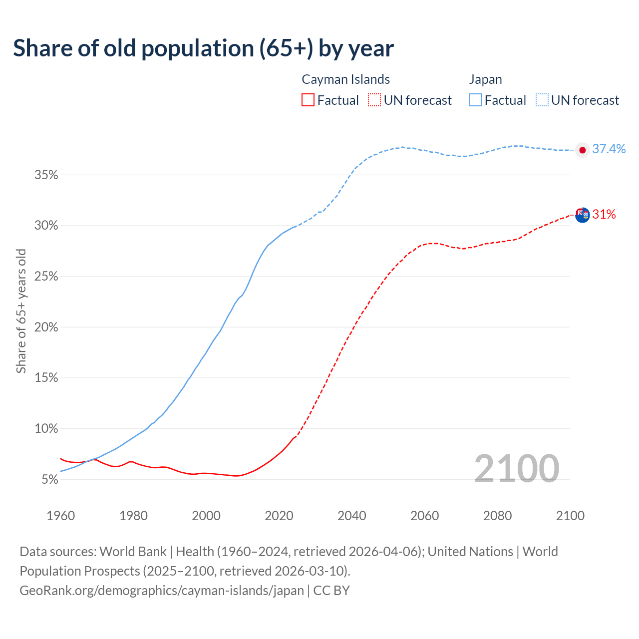 The share of older people aged 65 and over is 9% in the Cayman Islands and 29.8% in Japan. Life expectancy in the Cayman Islands compared to Japan .