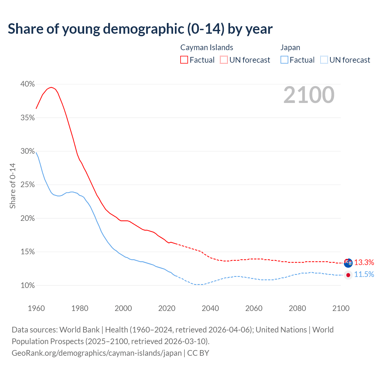 - The share of young demographic (0-15 years old) in the Cayman Islands is 16.2% vs 11.4% in Japan.