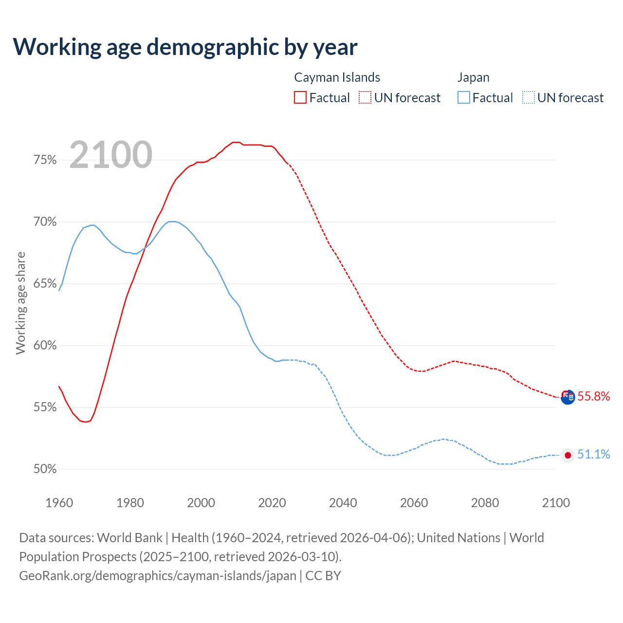 - The Cayman Islands has 58.1K working age adults (aged 15-64) vs 72.1M in Japan.