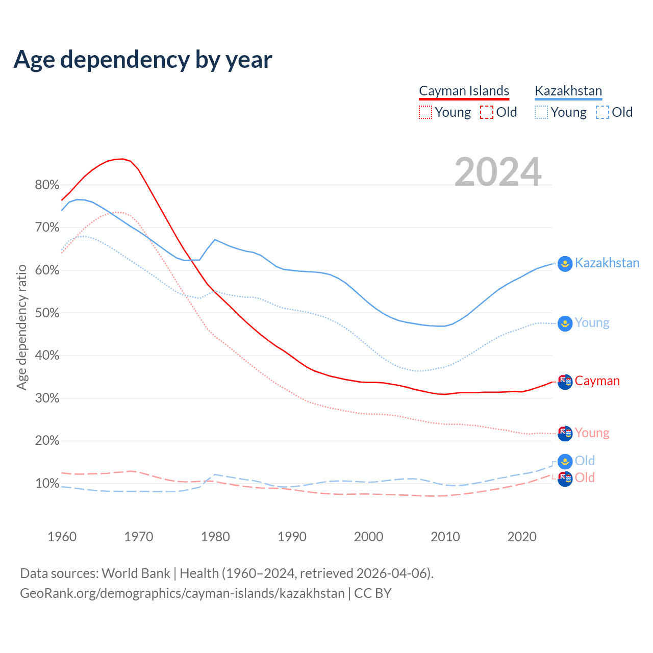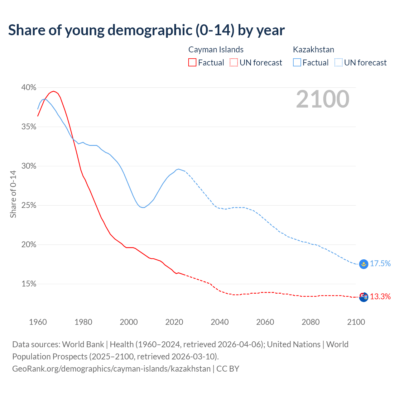 - The share of young demographic (0-15 years old) in the Cayman Islands is 16.2% vs 29.4% in Kazakhstan.