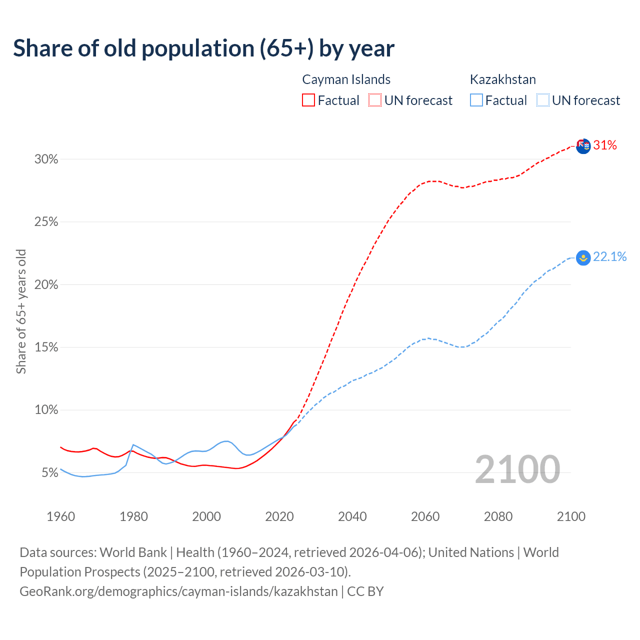 The share of older people aged 65 and over is 9% in the Cayman Islands and 8.65% in Kazakhstan. Life expectancy in the Cayman Islands compared to Kazakhstan .